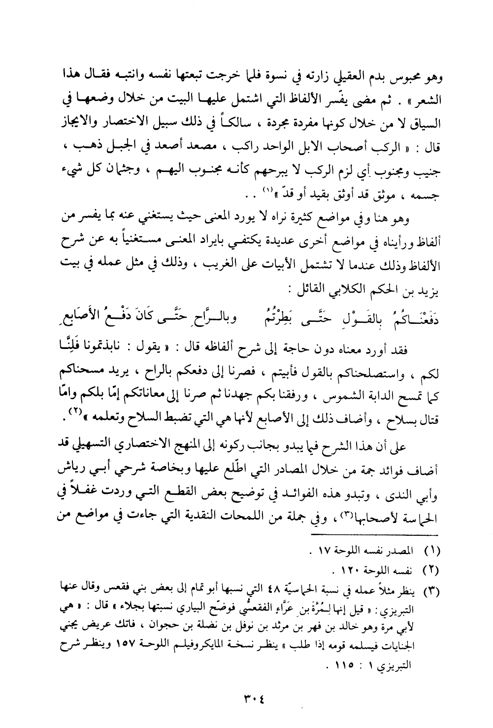 وهو هنا وفي مواضع كثيرة نراه لا يورد المعنى حيث يستغني عنه بما يفسر من ألفاظ ورأيناه في مواضع أخرى عديدة يكتفي بإيراد المعنى مستغنيًا به عن شرح الألفاظ وذلك عندما لا تشتمل الأبيات على الغريب، وذلك في مثل عمله في بيت يزيد بن الحكم الكلابي القائل:
