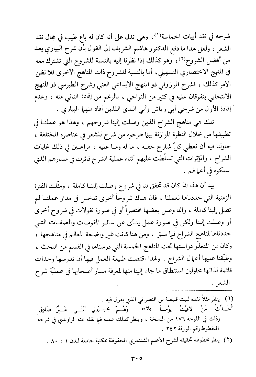 بيد أن هذا إن كان قد تحقق لنا في شروح وصلت إلينا كاملة، ومثلت الفترة الزمنية التي حددناها لعملنا، فإن هناك شروحًا أخرى تدخل في مدار عملنا لم تصل إلينا كاملة، وإنما وصل بعضها مختصرًا أو في صورة نقولات في شروح أخرى أو وصلت غلينا ولكن في صورة عمل ينأى عن سائر المقومات والصفات التي حددناها لمناهج الشراح فيما سبق، ومن هنا كانت غير واضحة المعالم في مناهجها، وكان من المتعذر دراستها تحت المناهج الخمسة التي درسناها في القسم من البحث، وطبقنا عليها أعمال الشراح. ولهذا اقتضت طبيعة العمل فيها أن ندرسها وحدات قائمة لذاتها محاولين استنطاق ما جاء إلينا منها لمعرفة مسار أصحابها في عملية شرح الشعر.