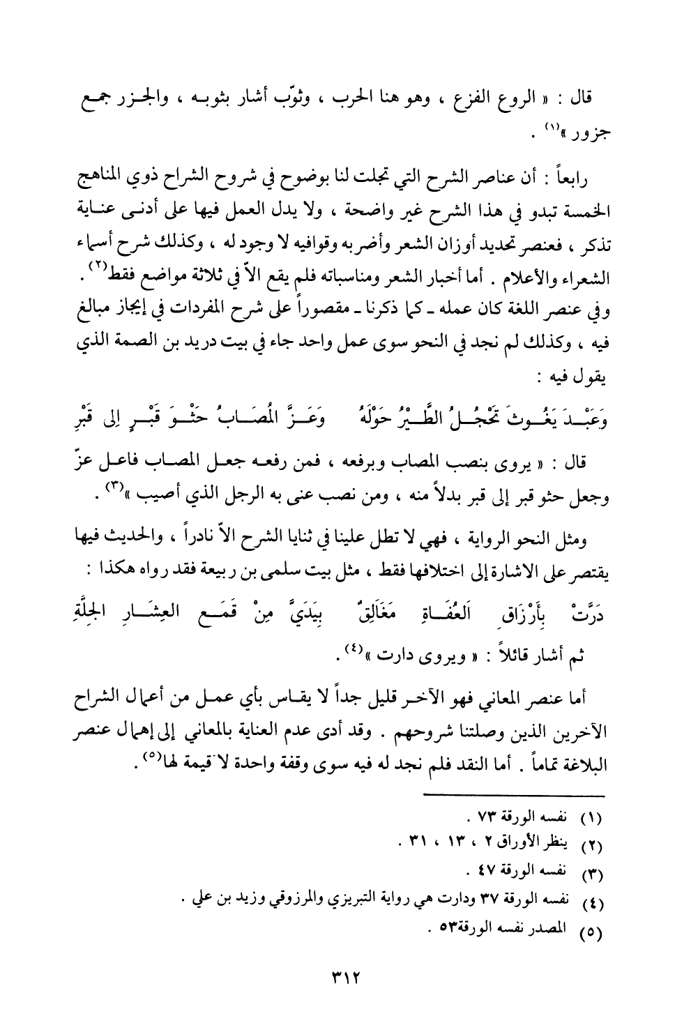 رابعًا: أن عناصر الشرح التي تجلت لنا بوضوح في شروح الشراح ذوي المناهج الخمسة تبدو في هذا الشرح غير واضحة، ولا يدل العمل فيها على أدنى عناية تذكر، فعنصر تحديد أوزان الشعر وأضربه وقوافيه لا وجود له، وكذلك شرح أسماء الشعراء والأعلام. أما أخبار الشعر ومناسباته فلم يقع إلا في ثلاثة مواضع فقط. وفي عنصر اللغة كان عمله _كما ذكرنا_ مقصورًا على شرح المفردات في إيجاز مبالغ فيه، وكذلك لم نجد في النحو سوى عمل واحد جاء في بيت دريد بن الصمة الذي يقول فيه: