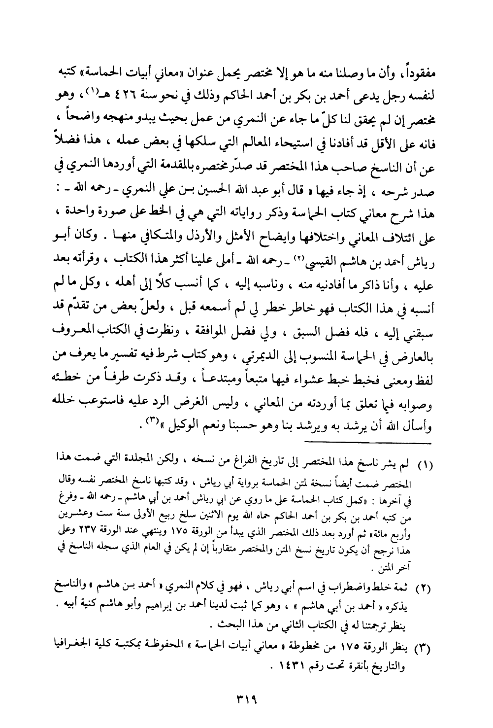 مفقودًا، وان ما وصلنا منه ما هو إلا مختصر عنوان "معاني أبيات الحماسة" كتبه لنفسه رجل يدعى أحمد بن بكر بن أحمد الحاكم وذلك في نحو سنة 426 هـ، وهو مختصر أن لم يحقق لنا كل ما جاء عن النمري من عمل بحيث يبدو منهجه واضحًا، فإنه على الأقل قد أفادنا في استيجاء المعالم التي سلكها في بعض عمله، هذا فضلًا عن أن الناسخ صاحب هذا المختصر قد صدر مختصره بالمقدمة التي أوردها النمري في صدر شرحة، إذ جاء فيها "قال أبو عبد الله الحسين بن على النمري- رحمة الله-: هذا شرح معاني كتاب الحماسة وذكر رواياته التي هي في الخط على صورة واحدة، على ائتلاف المعاني واختلافها وإيضاح الأمثل والأرذل والمتكافئ منها، وكان أبو رياش أحمد بن هاشم القيسي - رحمة الله- أملي علينا أكثر هذا الكتاب، وقرأته بعد عليه، وأنا ذاكر ما أفادنيه منه، وناسبه إليه، كما أنسب كلا إلى أهله، وكا ما لم أنسبه في هذا الكتاب فهو خاطر خطر لي لم أسمعه قبل، ونظرت في الكتاب المعروف بالعارض في الحماسة المنسوب إلى الديمرتي، وهو كتاب شرط فيه تفسير ما يعرف من لفظ ومعني فخبط خبط عشواء فيها متتبعًا ومبتدعًا، وقد ذكرت طرفًا من خطئه وصوابه فيما تعلق بما أوردته من المعاني، وليس الغرض الرد عليه فاستوعب خلله وأسال الله أن يرشد به ويرشد بنا وهو حسبنا ونعم الوكيل.