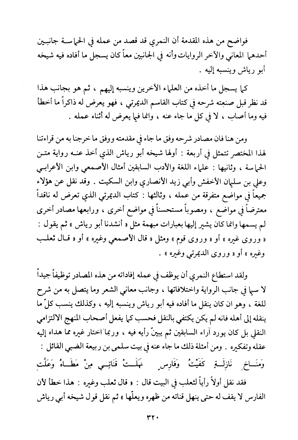 فواضح من هذه المقدمة أن النمري قد قصد من عمله في الحماسة جانبين أحمدهما المعاني والآخر الروايات وأنه في الجانبين معًا كان يسجل ما أفاده فيه شيخه أبو رياش وبنسبه إليه.