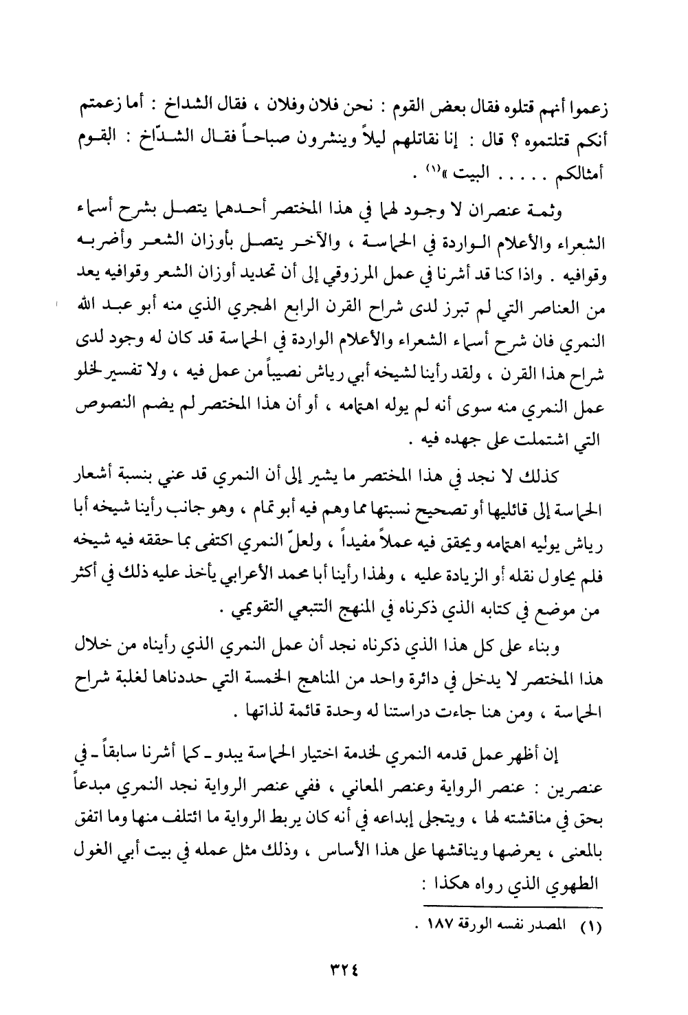 وبناء على كل هذا الذي ذكرناه نجد أن عمل النمري الذي رأيناه من خلال هذا المختصر لا يدخل في دائرة واحد من المناهج الخمسة التي حددناها لغلبة شراح الحماسة، ومن هنا جاءت دراستنا له وحدة قائمة لذاتها.