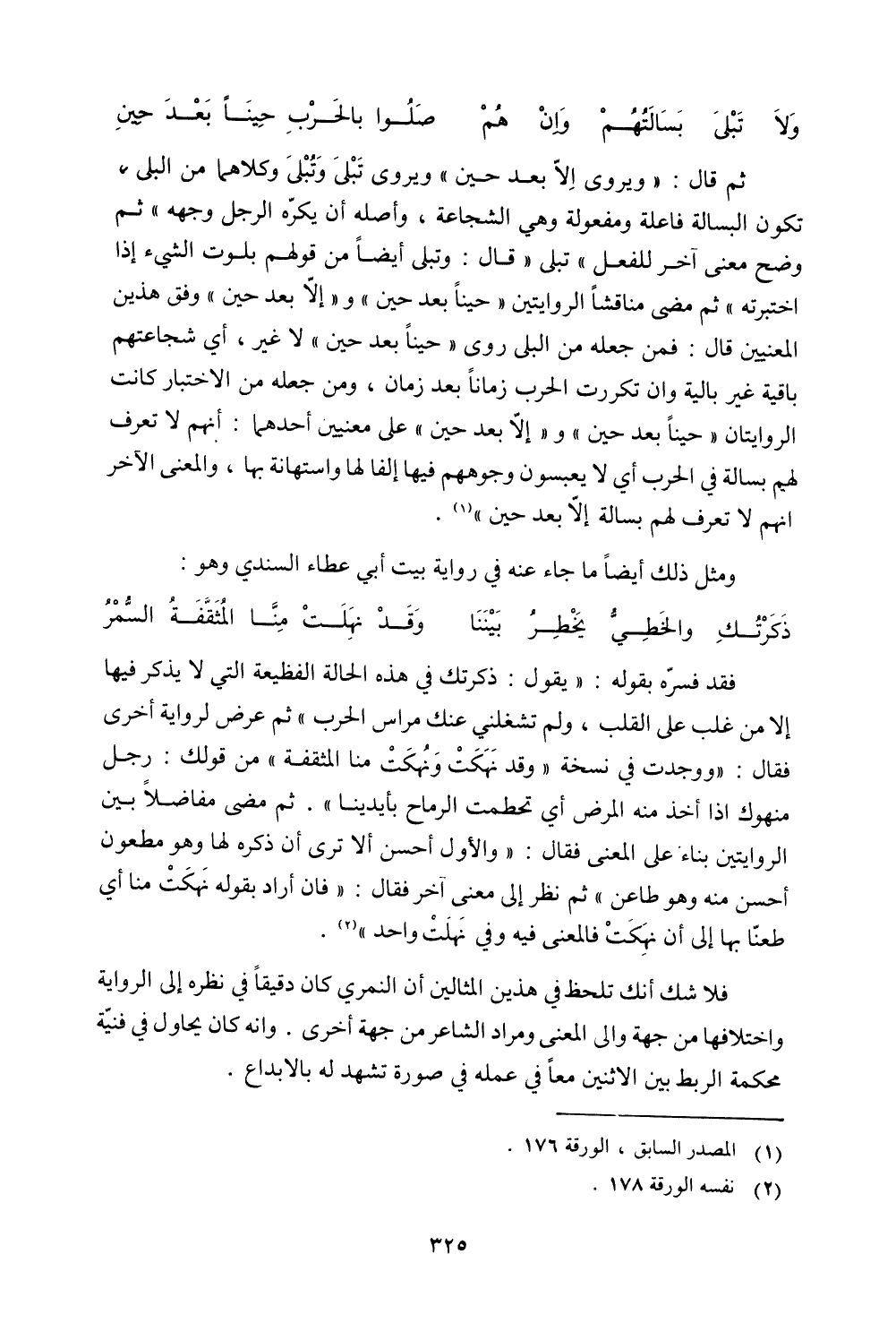 ثم قال: "ويروى إلا بعد حين" ويروى تبلى وتبلى وكلاهما من البلى، تكون البسالة فاعلة ومفعولة وهي الشجاعة، وأصله أن يكره الرجل وجهه" ثم وضح معنى آخر للفعل" تبلى "قال: وتبلى أيضاً من قولهم بلوت الشيء إذا اختبرته" ثم مضى مناقشاً الروايتين "حيناً بعد حين" و "إلا بعد حين" وفق هذين المعنيين قال: فمن جعله من البلى روى "حيناً بعد حين" لا غير، أي شجاعتهم باقية غير بالية وان تكررت الحرب زماناً بعد زمان، ومن جعله من الاختبار كانت الروايتان "حيناً بعد حين" و "إلا بعد حين" على معنيين أحدهما: أنهم لا تعرف لهم بسالة في الحرب أي لا يعبسون وجوههم فيها إلفا لها واستهانة بها، والمعنى الآخر إنهم لا تعرف لهم بسالة إلا بعد حين".