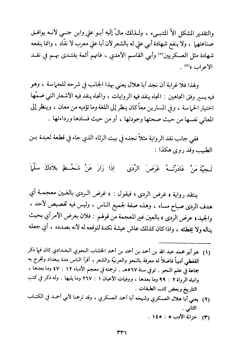 ولهذا فلا غرابة أن نجد أبا هلال يعني بهذا الجانب في شرحه للحماسة، وهو فيه يسير وفق اتجاهين: اتجاه ينتقد فيه الروايات، واتجاه ينقد فيه الأشعار التي ضمّها اختيار الحماسة، وفى المسارين معًا كان ينظر إلي اللغة وما تؤديه من معان، وينتظر إلى المعاني نفسها من حيث صحتها وجودتها، أو من حيث فسادها ورداءتها.