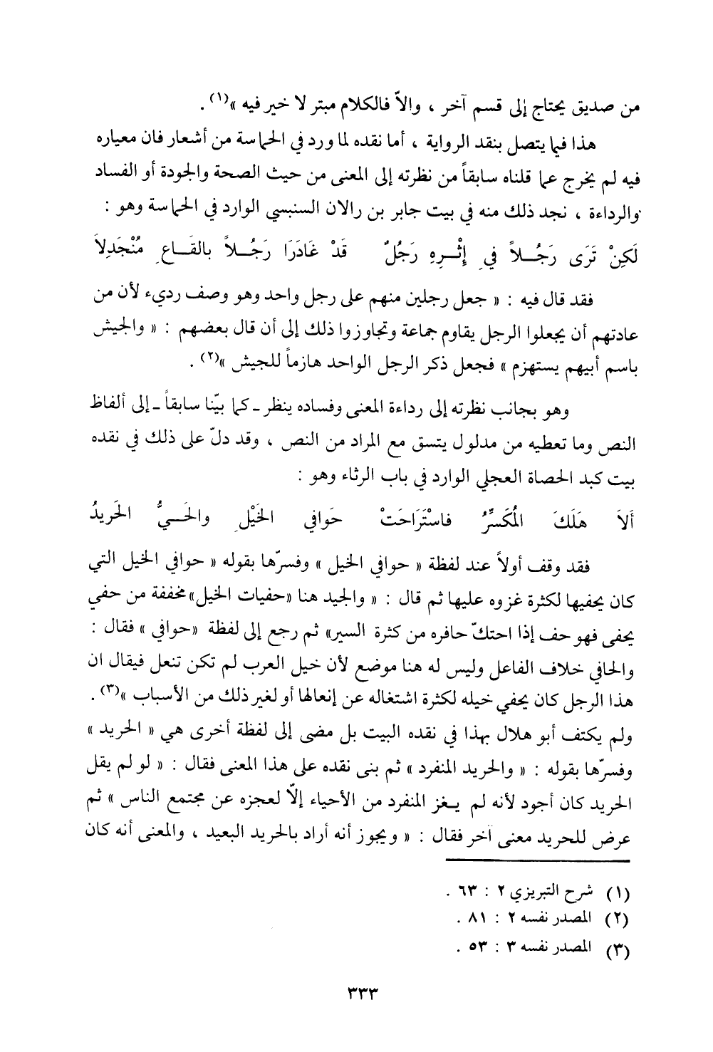 هذا فيما يتصل بنقد الرواية، أما نقده لما ورد في الحماسة من أشعار فان معياره فيه لم يخرج عما قلناه سابقًا من نظريته إلى المعنى من حيث الصحة والجودة أو الفساد والرداءة، نجد ذلك منه في بيت جابر بن رالان السنيبسي الوارد في الحماسة وهو: