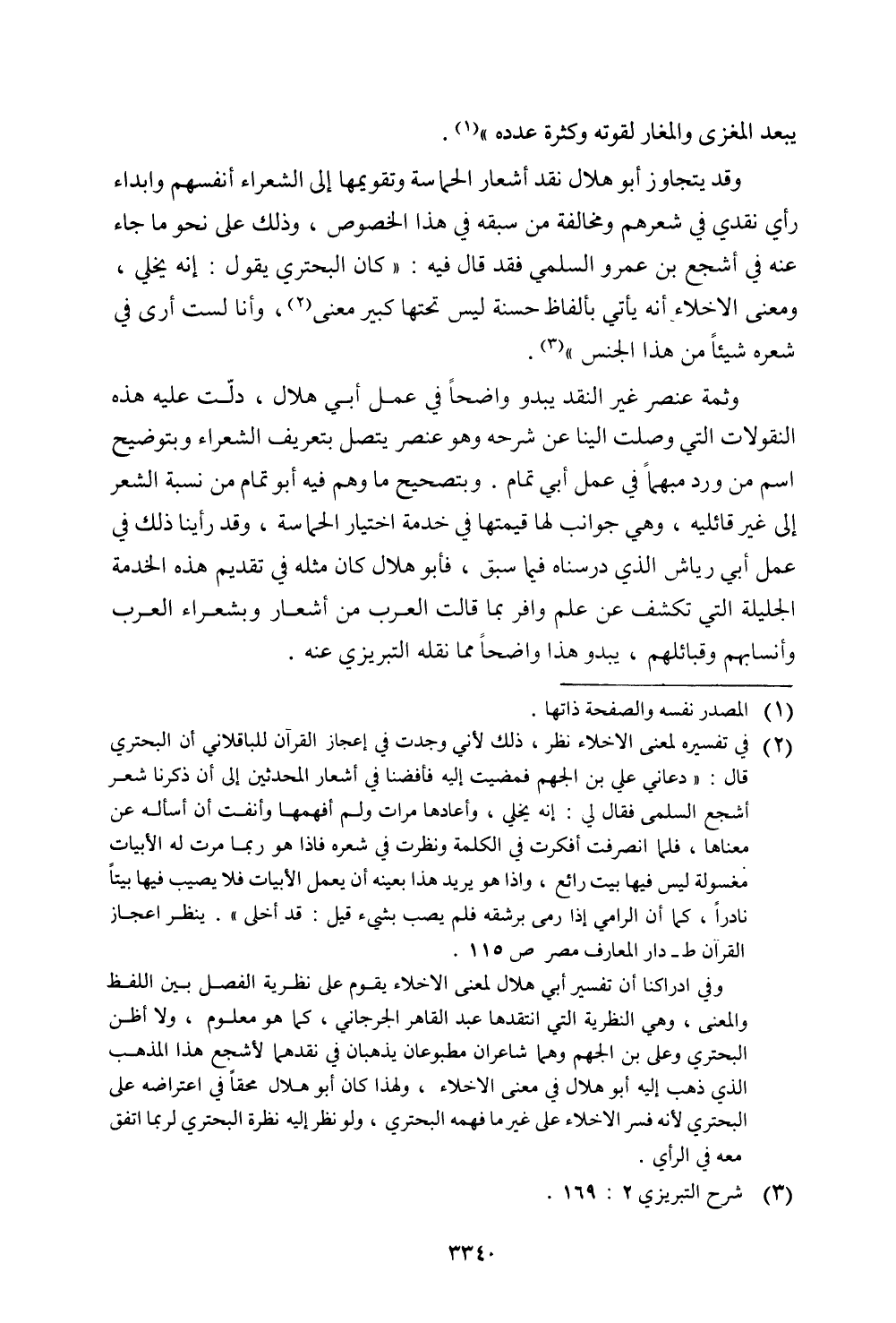 وثمة عنصر غير النقد يبدو واضحًا في عمل أبي هلال، دلّت عليه هذه النقولات التى وصلت الينا عن شرحه وهو عنصر يتصل بتعريف الشعراء وبتوضيح اسم من ورد مبهمًا في عمل أبي تمام ز وبتصحيح ما وهم فيه أبو تمام من نسبه الشعر إلى غير قائليه، وهى جوانب لها قيمتها في خدمة اختيار الحماسة، وقد رأينا ذلك في عمل أبي رياش الذي درسناه فيما سبق، فأبو هلال كان مثله في تقديم هذه الخدمة الجليلة التي تكشف عن علم وافر بما قالت العرب من أشعار وبشعراء العرب وأنسابهم وقبائلهم، يبدو هذا واضحًا مما نقله التبريزى عنه.