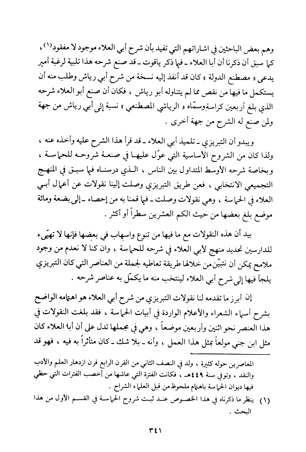 ويبدو أن التبريزى _ تلميذ أبي العلاء _ قد قرأ هذا الشرح عليه وأخذه عنه، ولذا كان من الشروح الأساسية التي عوّل عليها في صنعة شروحه للحماسة، وبخاصة شرحه الأوسط المتداول بين الناس، الذي درسناه فيما سبق في المنهج التجميعي الانتخابي، فعن طريق التبريزي وصلت إلينا نقولات عن أعمال أبي العلاء في الحماسة، وهي نقولات وصلت _ فيما قمنا به من إحصاء _ إلى بضعة ومائة موضع بلغ بعضها من حيث الكم العشرين سطرًا أو أكثر.