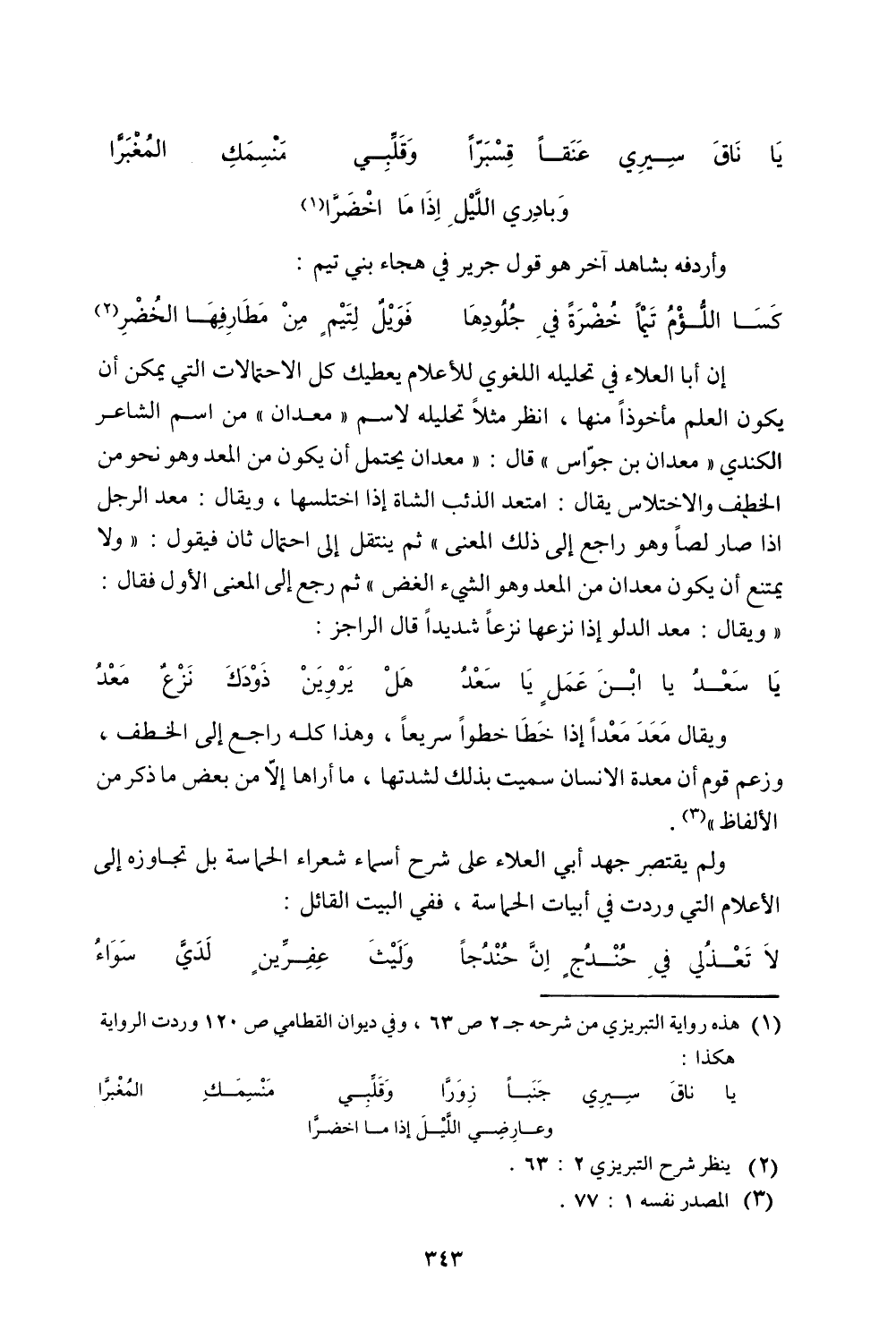 ولم يقتصر جهد أبي العلاء على شرح أسماء شعراء الحماسة بل تجاوزه إلى الأعلام التي وردت في أبيات الحماسة، ففي البيت القائل: