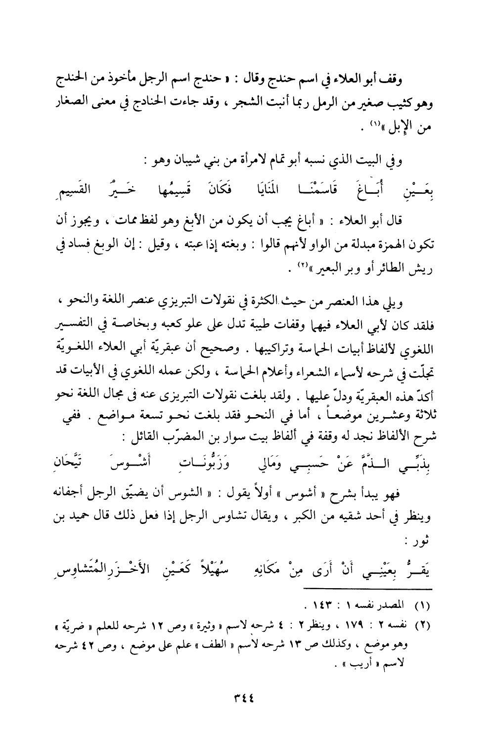 ويلي هذا العنصر من حيث الكثرة في نقولات التبريزي عنصر اللغة والنحو، فلقد كان لأبي العلاء فيهما وقفات طيبة تدل على علو كعبه وبخاصة في التفسير اللغوي لألفظ أبيات الحماسة وتراكيبها. وصحيح أن عبقريّة أبي العلاء اللغويّة تجلّت في شرحه لأسماء الشعراء وأعلام الحماسة، ولكن عمله اللغوى في الأبيات قد أكد ّ هذه العبقريّة ودلّ عليها. ولقد بلغت نقولات التبريزي عنه فى مجال اللغة نحو ثلاثة وعشرين موضعًا، أما في النحو فقد بلغت نحو تسعة مواضع. ففي شرح الألفاظ نجد له وقفة في ألفاظ بيت سوار بن المضرّب القائل: