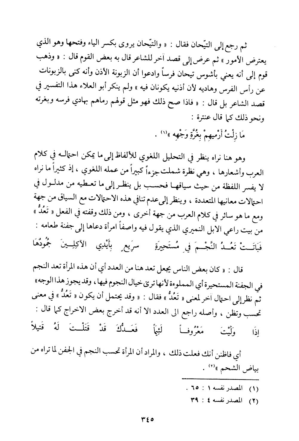 وهو هنا نراه ينظر في التحليل اللغوي للألفاظ إلى ما يمكن احتماله في كلام العرب وأشعارها، وهي نظرة شملت جزءًا كبيرًا من عمله اللغوي، إذ كثيرًا ما نراه لا يفسر اللفظة من حيث سياقها فحسب بل ينظر إلى ما تعطيه من مدلول في احتمالات معانيها المتعددة، وينظر إلى عدم تنافي هذه الاحتمالات مع السياق من جهة ومع ما هو سائر في كلام العرب من جهة أخرى، ومن ذلك وقفته في الفعل ((تَعُدُّ)) من بيت راعي الابل النميري الذي يقول فيه واصفًا امرأة دعاها إلى جفنة طعامه: