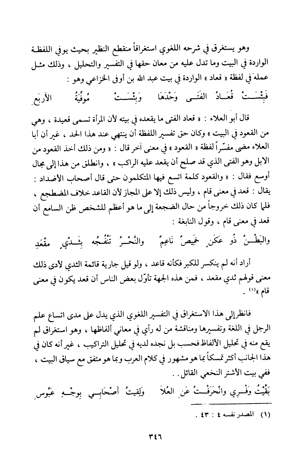قال أبو العلاء: ((قعاد الفتى ما يقعده في بيته لأن المرأة تسمى قعيدة، وهي من القعود في البيت)) وكان حق تفسير اللفظة أن ينتهي عند هذا الحد، غير أن أبا العلاء مضى مفسّرًا لفظة ((القعود)) في معنى آخر قال: ((ومن ذلك أخذ القعود من الابل وهو الفتى الذي قد صلح أن يقعد عليه الراكب))، وانطلق من هذا إلى مجال أوسع فقال: ((والقعود كلمة اتسع فيها المتكلمون حتى قال أصحاب الأضداد: يقال: قعد في معنى قام، وليس ذلك إلا على المجاز لأن القاعد خلاف المضطجع، فلما كان ذلك خروجًا من حال الضجعة إلى ما هو أعظم للشخص ظن السامع أن قعد في معنى قام، وقول النابغة: