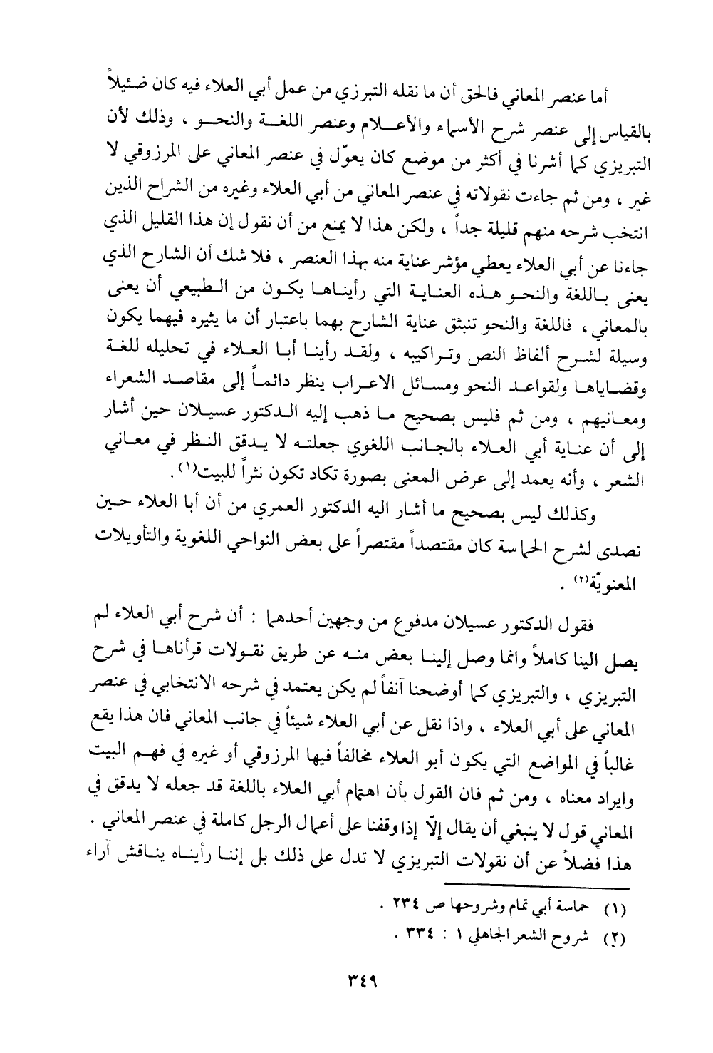 وكذلك ليس بصحيح ما أشار إليه الدكتور العمري من أن أبا العلاء حين تصدى لشرح الحماسة كان مقتصدًا على بعض النواحي اللغوية والتأويلات المعنويّة.