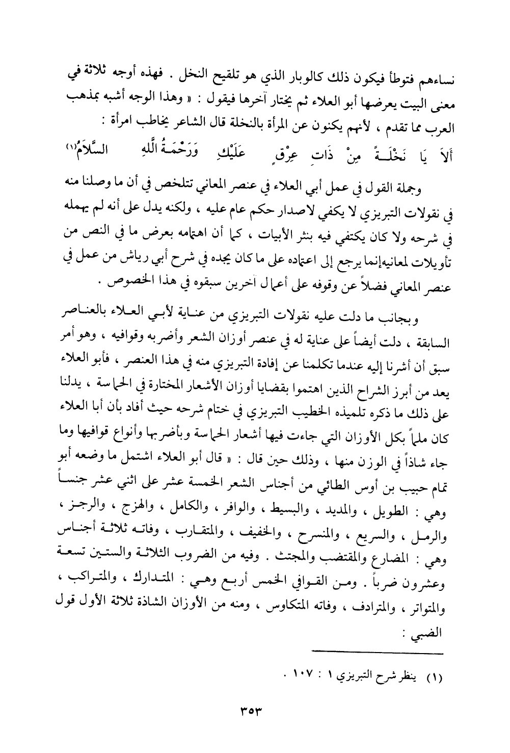 نساءهم فتوطأ ذلك كالوبار الذي هو تلقيح النخل. فهذه أوجه ثلاثة في معنى البيت يعرضها أبو العلاء ثم يختار آخرها فيقول: "وهذا الوجه أشبه بمذهب العرب مما تقدم، لأنهم يكنون عن المرأة بالنخلة قال الشاعر يخاطب امرأة: