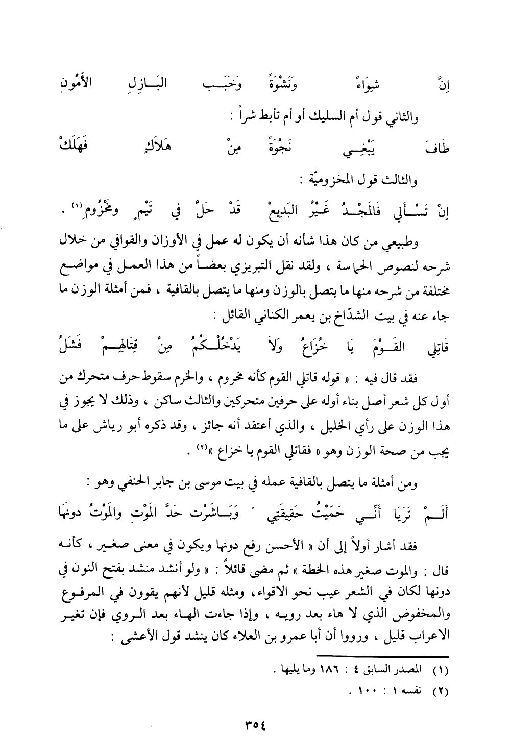 فقد قال فيه: "قوله قاتلي القوم كأنه مخروم، والخرم سقوط حرف متحرك من أول كل شعر أصل بناء أوله على حرفين متحركين والثالث ساكن، وذلك لا يجوز في هذا الوزن على رأي الخليل، والذي أعتقد أنه جائز، وقد ذكره أبو رياش على ما يجب من صحة الوزن وهو "فقاتلي القوم يا خزاع".