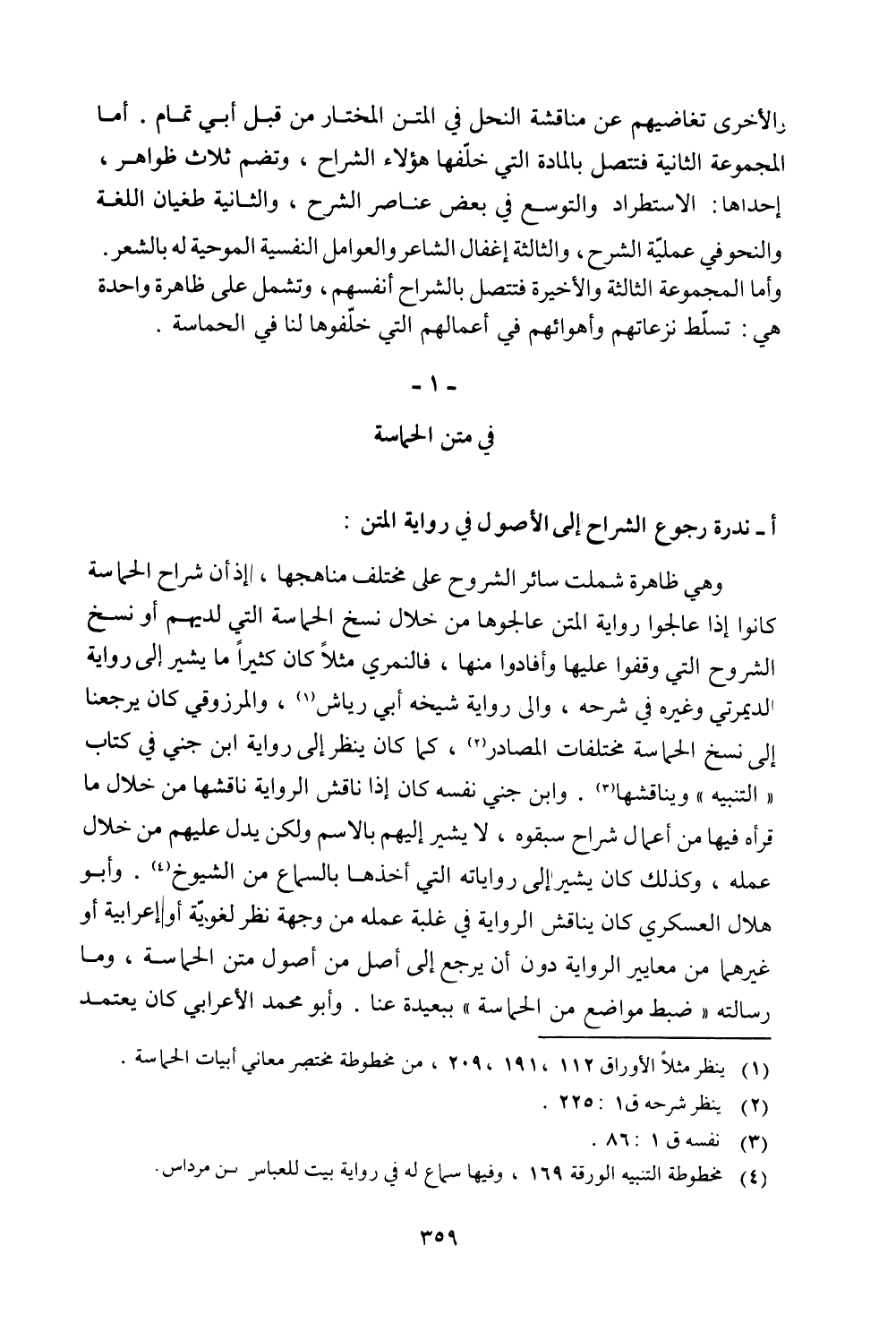 والأخرى تغاضيهم عن مناقشة النحل في المتن المختار من قبل أبي تمام. أما المجموعة الثانية فتتصل بالمادة التي خلفها هؤلاء الشراح، وتضم ثلاث ظواهر، إحداها: الاستطراد والتوسع في بعض عناصر الشرح، والثانية طغيان اللغة والنحو في عملية الشرح، والثالثة إغفال الشاعر والعوامل النفسية الموحية له بالشعر. وأما المجموعة الثالثة والأخيرة فتتصل بالشراح أنفسهم، وتشمل على ظاهرة واحدة هي: تسلط نزعاتهم وأهوائهم في أعمالهم التي خلفوها لنا في الحماسة.