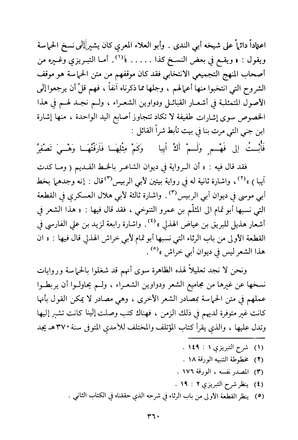 اعتمادًا دائمًا على شيخه أبي الندى. وأبو العلاء المعري كان يشير إلى نسخ الحماسة ويقول: "ويقع في بعض النسخ كذا ...... ". أما التبريزي وغيره من أصحاب المنهج التجميعي الانتخابي فقد كان موقفهم من متن الحماسة هو موقف الشروح التي انتخبوا منها أعمالهم، وجلها مما ذكرناه آنفًا، فهم قل أن يرجعوا إلى الأصول المتمثلة في أشعار القبائل ودواوين الشعراء، ولم نجد لهم في هذا الخصوص سوى إشارات طفيفة لا تكاد تتجاوز أصابع اليد الواحدة، منها إشارة ابن جني التي مرت بنا في بيت تأبط شرًا القائل:
