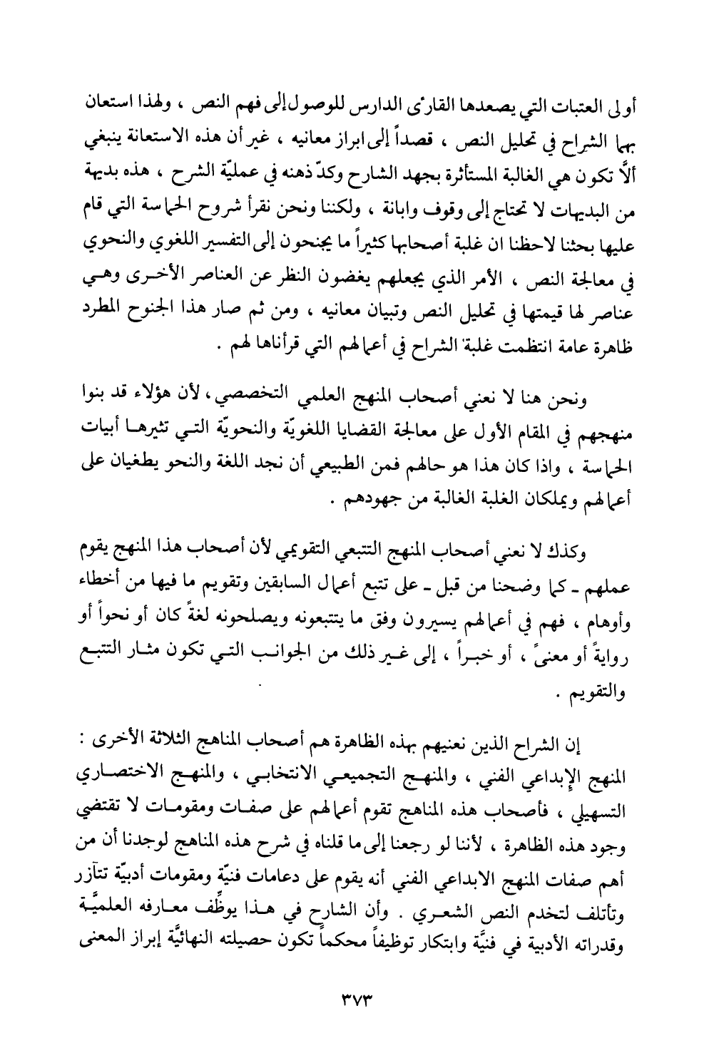 إن الشراح الذين نعنيهم بهذه الظاهرة هم أصحاب المناهج الثلاثة الأخرى: المنهج الإبداعي الفني، والمنهج التجميعي الانتخابي، والمنهج الاختصاري التسهيلي، فأصحاب هذه المناهج تقوم أعمالهم على صفات ومقومات لا تقتضي وجود هذه الظاهرة، لأننا لو رجعنا إلى ما قلناه في شرح هذه المناهج لوجدنا أن من أهم صفات المنهج الإبداعي الفني أنه يقوم على دعامات فنية ومقومات أدبية تتآزر وتأتلف لتخدم النص الشعري. وأن الشارح في هذا يوظف معارفه العلمية وقدراته الأدبية في فنية وابتكار توظيفا محكما تكون حصيلته النهائية إبراز المعنى