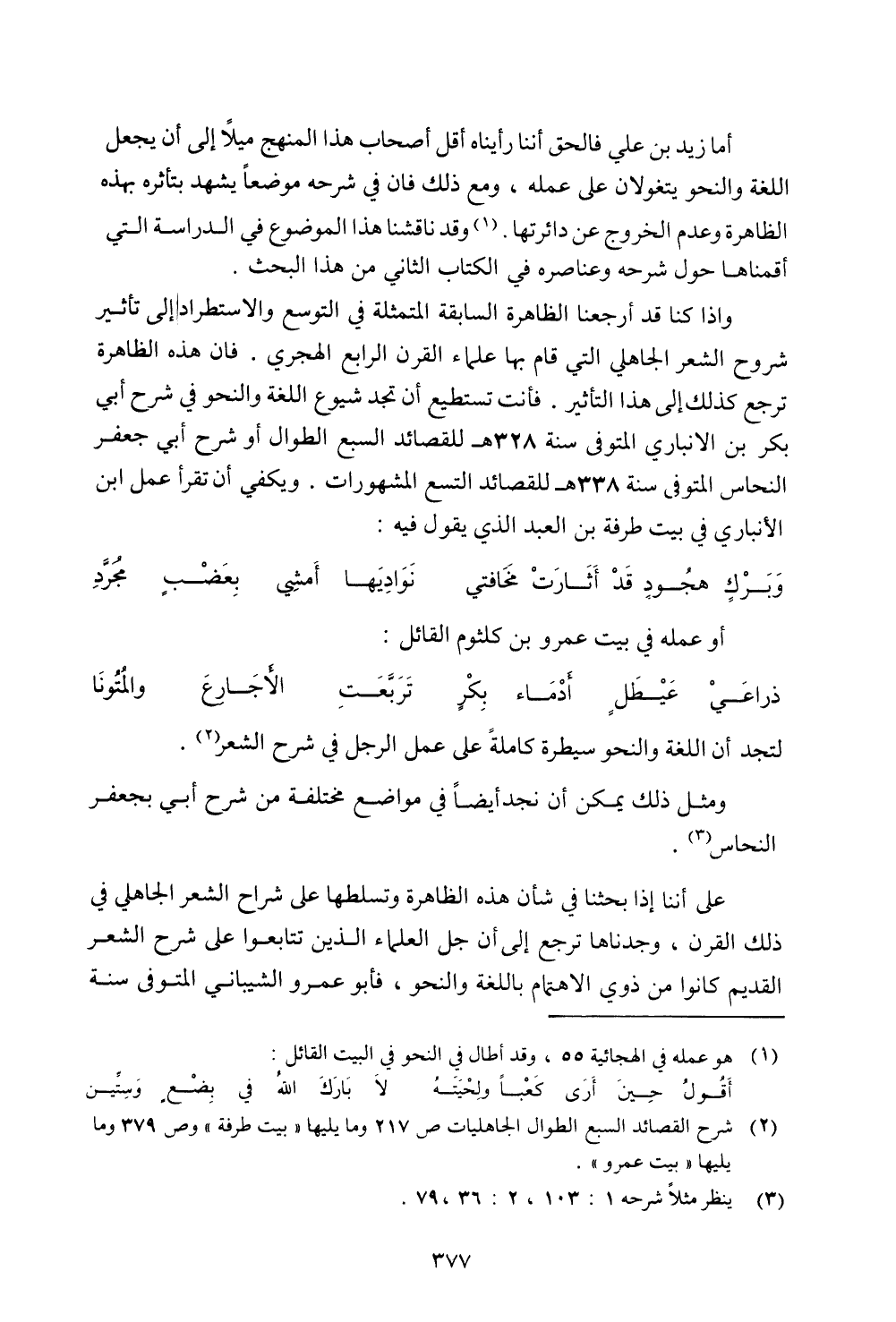 وإذا كنا قد أرجعنا الظاهرة السابقة المتمثلة في التوسع والاستطراد إلى تأثير شروح الشعر الجاهلي التي قام بها علماء القرن الرابع الهجري. فان هذه الظاهرة ترجع كذلك إلى هذا التأثير. فأنت تستطيع أن تجد شيوع اللغة والنحو في شرح أبي بكر بن الانباري المتوفى سنة 328 هـ للقصائد السبع الطوال أو شرح أبي جعفر النحاس المتوفى سنة 338 هـ للقصائد التسع المشهورات. ويكفي أن تقرأ عمل ابن الانباري في بيت طرفة بن العبد الذي يقول فيه:
