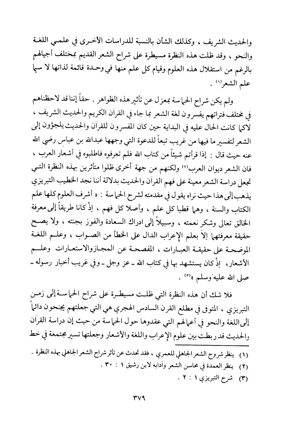 فلا شك أن هذه النظرة التي ظلت مسيطرة على شراح الحماسة إلى زمن التبريزي، المتوفى في مطلع القرن السادس الهجري هي التي جعلتهم يجنحون دائمًا إلى اللغة والنحو في أعمالهم التي عقدوها حول الحماسة من حيث إن دراسة القرآن والحديث قد ربطت بين علوم الإعراب واللغة والأشعار وجعلتها تسير مجتمعة في خط