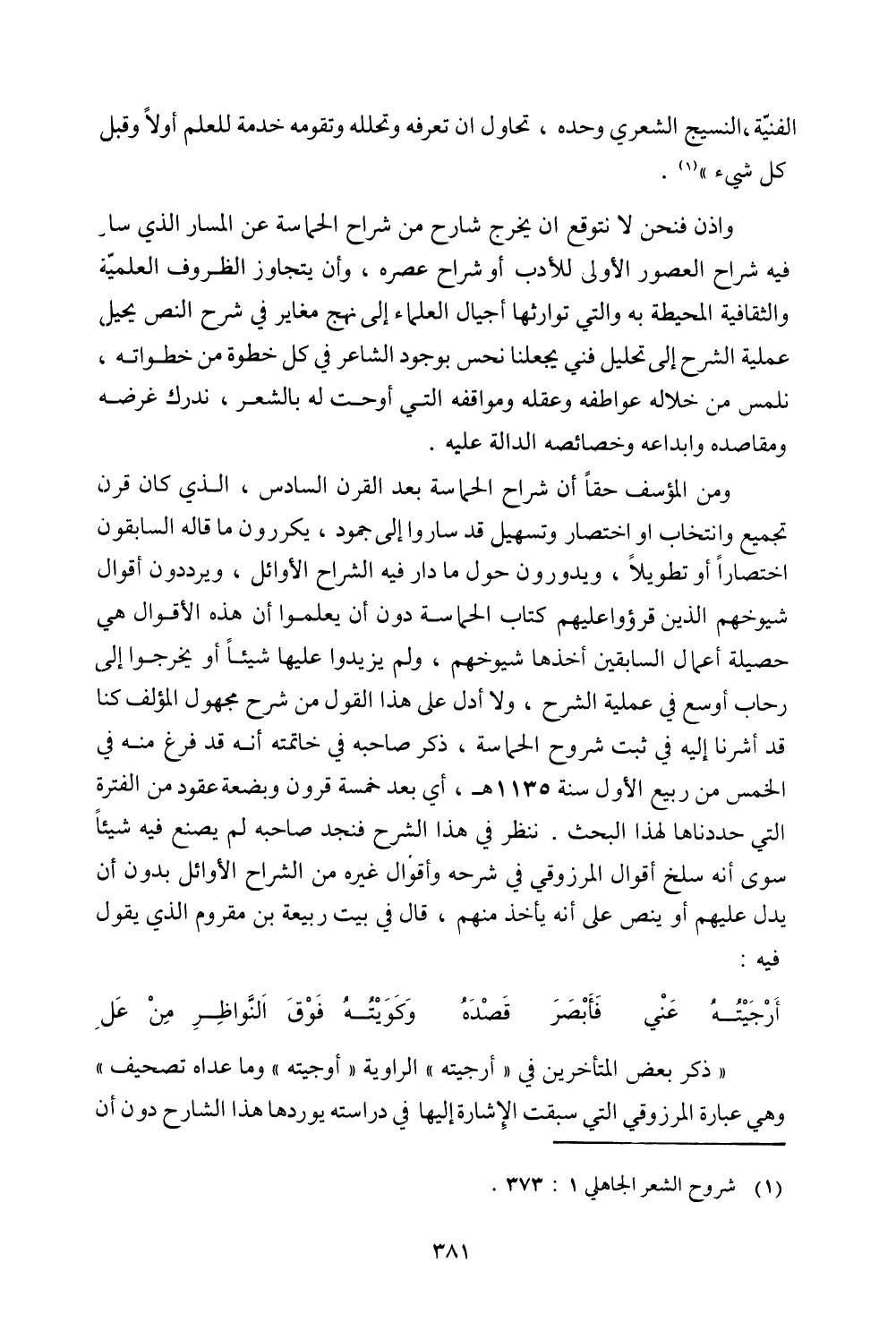 (ذكر بعض المتأخرين في (أرجيته) الرواية (أوجيته) وما عداه تصحيف) وهي عبارة المرزوقي التي سبقت الإشارة إليها في دراسته يوردها هذا الشارح دون أن
