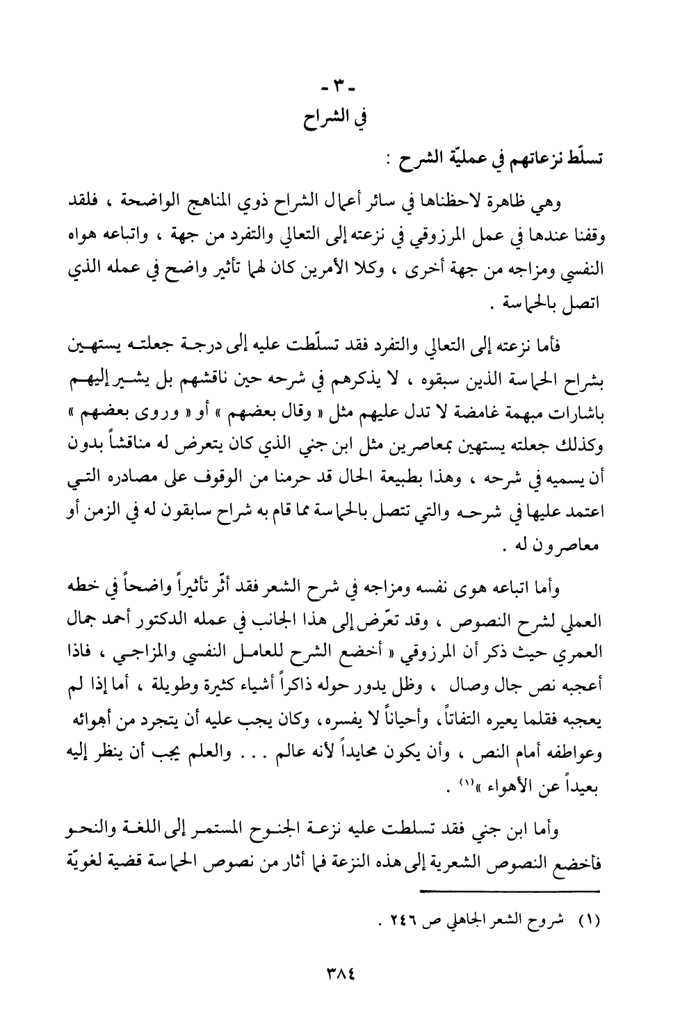 وهي ظاهرة لاحظناها في سائر أعمال الشراح ذوي المناهج الواضحة، فلقد وقفنا عندها في عمل المرزوقي في نزعته إلى التعالي والتفرد من جهة، وإتباعه هواه النفسي ومزاجه من جهة أخرى، وكلا الأمرين كان لهما تأثير واضح في عمله الذي اتصل بالحماسة.