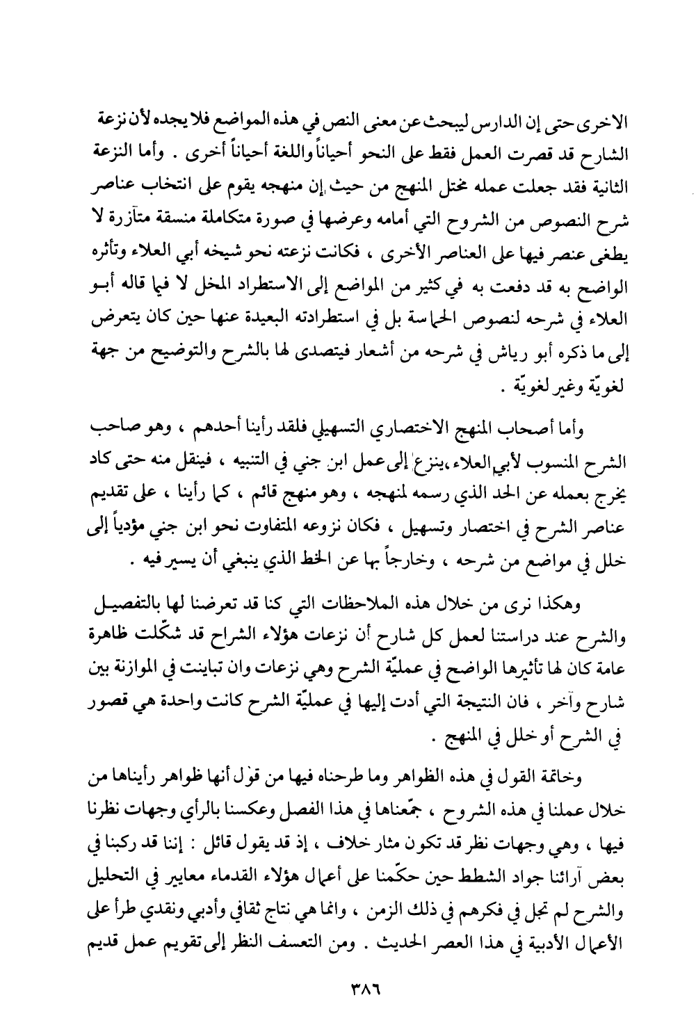 وأما أصحاب المنهج الاختصاري التسهيلي فلقد رأينا أحدهم، وهو صاحب الشرح المنسوب لأبي العلاء، ينزع إلى عمل ابن جني في التنبيه، فينقل منه حتى كاد يخرج بعمله عن الحد الذي رسمه لمنهجه، وهو منهج قائم، كما رأينا، على تقديم عناصر الشرح في اختصار وتسهيل، فكان نزوعه المتفاوت نحو ابن جني مؤديًا إلى خلل في مواضع من شرحه، وخارجًا بها عن الخط الذي ينبغي أن يسير فيه.