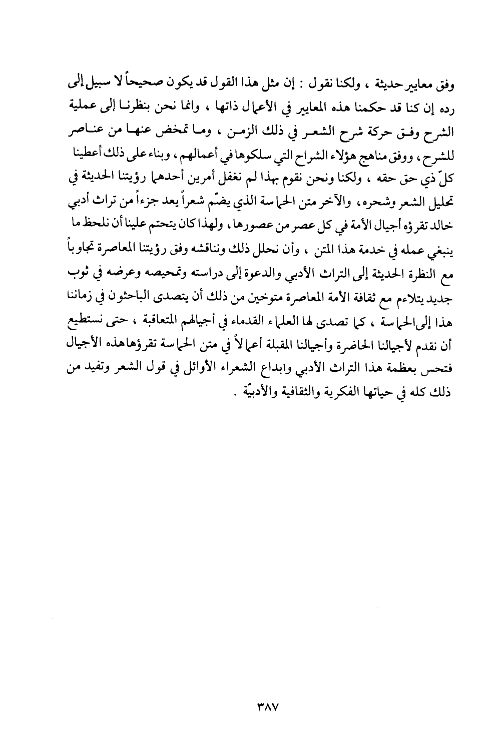 وفق معايير حديثة، ولكنا نقول: إن مثل هذا القول قد يكون صحيحا لا سبيل إلى رده إن كنا قد حكمنا هذه المعايير في الأعمال ذاتها، وإنما نحن بنظرنا إلى عملية الشرح وفق حركة شرح الشعر في ذلك الزمن، وما تمخض عنها من عناصر للشرح، ووفق مناهج هؤلاء الشراح التي سلكوها في أعمالهم، وبناء على ذلك أعطينا كل ذي حق حقه، ولكنا ونحن نقوم بهذا لم نغفل أمرين أحدهما رؤيتنا الحديثة في تحليل الشعر وشحره، والآخر متن الحماسة الذي يضم شعرا يعد جزءا من تراث أدبي خالد تقرؤه أجيال الأمة في كل عصر من عصورها، ولهذا كان يتحتم علينا أن نلحظ ما ينبغي عمله في خدمة هذا المتن، وأن نحلل ذلك ونناقشه وفق رؤيتنا المعاصرة تجاوبًا مع النظرة الحديثة إلى التراث الأدبي والدعوة إلى دراسته وتمحيصه وعرضه في ثوب جديد يتلاءم مع ثقافة الأمة المعاصرة متوخين من ذلك أن يتصدى الباحثون في زماننا هذا إلى الحماسة، كما تصدى لها العلماء القدماء في أجيالهم المتعاقبة، حتى نستطيع أن نقدم لأجيالنا الحاضرة وأجيالنا المقبلة أعمالا في متن الحماسة تقرؤها هذه الأجيال فتحس بعظمة هذا التراث الأدبي وإبداع الشعراء الأوائل في قول الشعر وتفيد من ذلك كله في حياتها الفكرية والثقافية والأدبية.