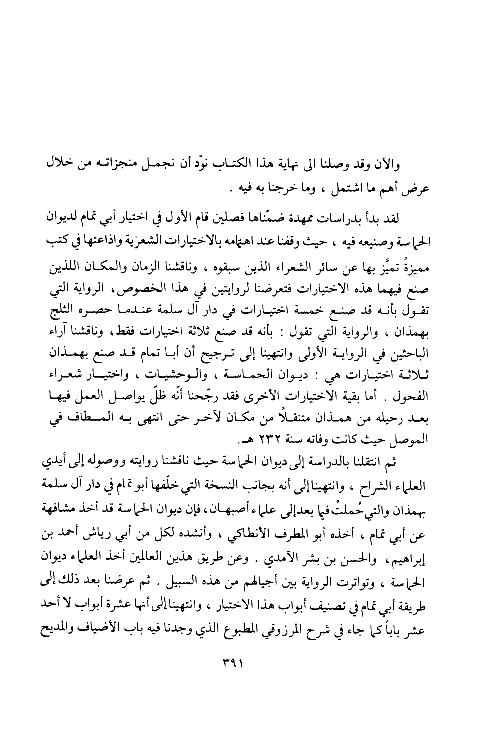 ثم انتقلنا بالدراسة إلى ديوان الحماسة حيث ناقشنا روايته ووصوله إلى أيدي العلماء الشراح، وانتهينا إلى أنه بجانب النسخة التي خلفها أبو تمام في دراسة آل سلمه بهمذان والتي حملت فيما بعد إلى علماء أصبهان، فإن ديوان الحماسة قد أخذ مشافهة عن أبي تمام، أخذه أبو المطرف الأنطاكي، وأنشده لكل من أبي رياش أحمد بن إبراهيم، والحسن بن بشر الآمدي. وعن طريق هذين العالمين أخذ العلماء ديوان الحماسة، وتواترت الرواية بين أجيالهم من هذه السبيل. ثم عرضنا بعد ذلك إلى طريقة أبي تمام في تصنيف أبواب هذا الاختبار، وانتهينا إلى أنها عشرة أبواب لا أحد عشر بابًا كما جاء في شرح المرزوقي المطبوع الذي وجدنا فيه باب الأضياف والمديح
