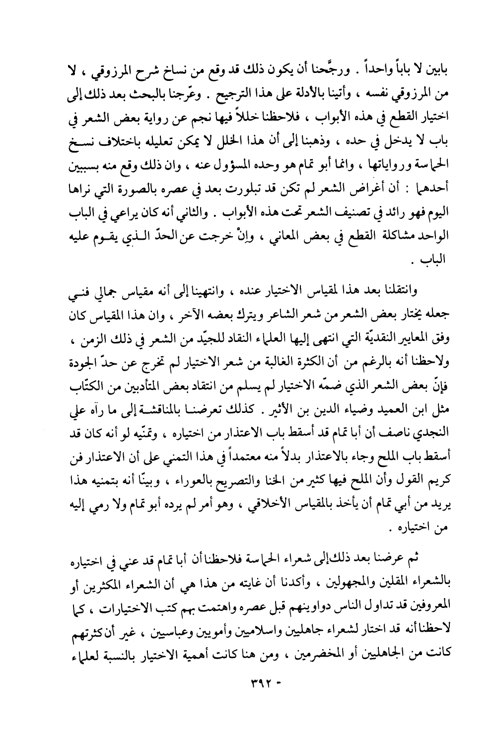 بابين لا بابًا واحدًا. ورجحنا أن يكون قد وقع من نساخ شرح المرزوقي، لا من المرزوقي نفسه، وأتينا بالأدلة على هذا الترجيح. وعرجنا بالبحث بعد ذلك إلى اختيار القطع في هذه الأبواب، فلاحظنا خللًا فيها نجم عن رواية بعض الشعر في باب لا يدخل في حده، وذهبنا إلى أن هذا الخلل لا يمكن تعليله باختلاف نسخ الحماسة وروايتها، وإنما أبو تمام هو وحده المسؤول عنه، وإن ذلك وقع منه بسببين أحدهما: أن أغراض الشعر لم تكن قد تبلورت بعد في عصره بالصورة التي نراها اليوم فهو رائد في تصنيف الشعر تحت هذه الأبواب. والثاني أنه كان يراعي في الباب الواحد مشاكله القطع في بعض المعاني، وإن خرجت عن الحد الذي يقوم عليه الباب.