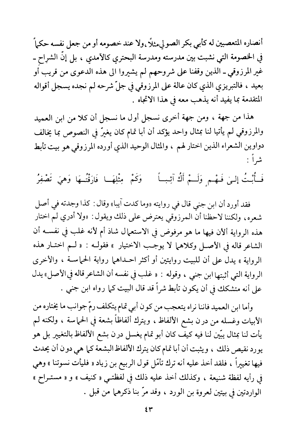 هذا من جهة، ومن جهة أخرى نسجل أول ما نسجل أن كلا من ابن العميد والمرزوقي لم يأتيا لنا بمثال واحد يؤكد أن أبا تمام كان يغير في النصوص بما يخالف دواوين الشعراء الذين اختار لهم، والمثال الوحيد الذي أورده المرزوقي هو بيت تأبط شرًا: