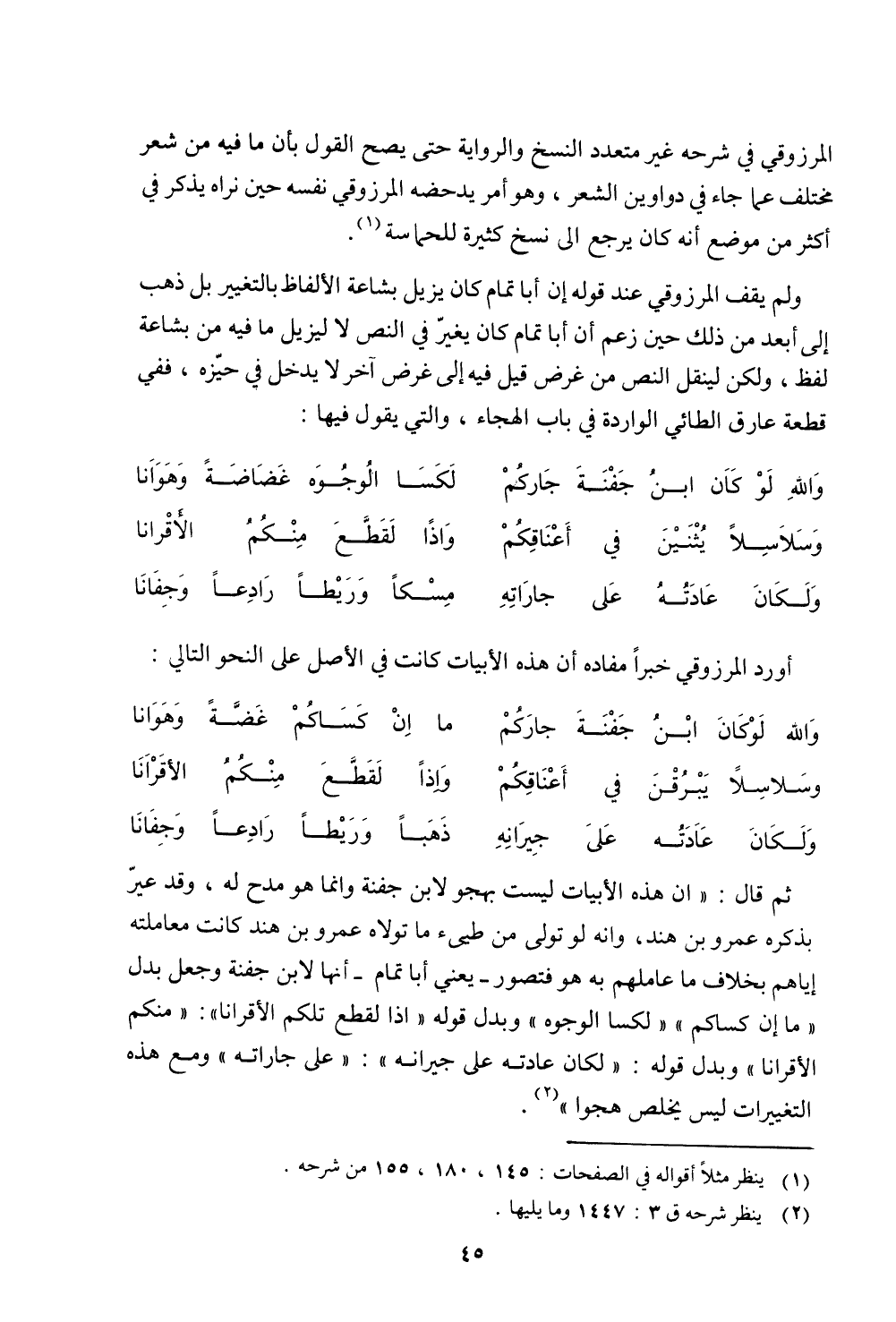 المرزوقي في شرحه غير متعدد النسخ والرواية حتى يصح القول بأن ما فيه من شعر مختلف عما جاء في دواوين الشعر، وهو أمر يدحضه المرزوقي نفسه حين نراه يذكر في أكثر من موضع أنه كان يرجع إلى نسخ كثيرة للحماسة.