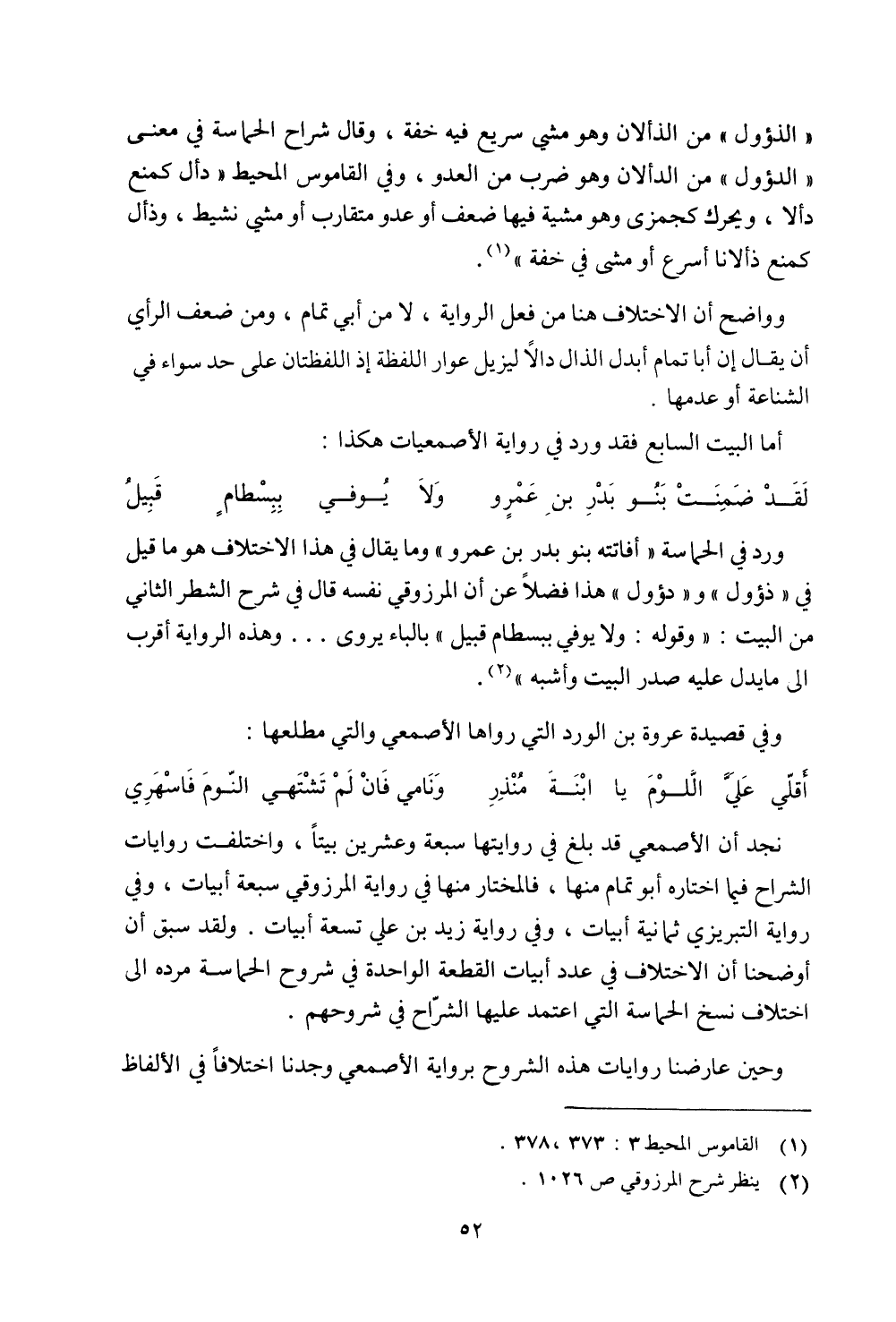 ورد في الحماسة "أفاتته بنور بدر بن عمرو" وما يقال في هذا الاختلاف هو ما قيل في "ذؤول" و "دؤول" هذا فضلًا عن أن المرزوقي نفسه قال في شرح الشطر الثاني من البيت: "وقوله: ولا يوفي ببسطام قبيل" بالباء يروي ... وهذه الرواية أقرب إلى ما يدل عليه صدر البيت وأشبه".