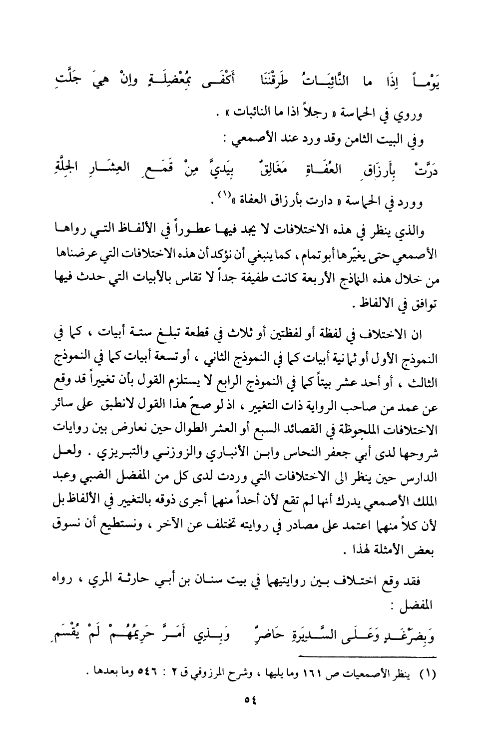 أن الاختلاف في لفظة أو لفظتين أو ثلاث في قطعة تبلغ ستة أبيات، كما في النموذج الأول أو ثمانية أبيات كما في النموذج الثاني، أو تسعة أبيات كما في النموذج الثالث، أو أحد عشر بيتًا كما في النموذج الرابع لا يستلزم القول بأن تغييرًا قد وقع عن عمد من صاحب الرواية ذات التغيير، إذ لو صح هذا القول لا نطبق على سائر شروحها لدى أبي جعفر النحاس وابن الأنباري الزوزني والتبريزي. ولعل الدارس حين ينظر إلى الاختلافات التي وردت لدى كل من المفضل الضبي وعبد الملك الأصمعي يدرك أنها لم تقع لأن أحدًا منهما أجرى ذوقه بالتغيير في الألفاظ بل لأن كلًا منهما اعتمد على مصادر في روايته تختلف عن الآخر، ونستطيع أن نسوق بعض الأمثلة لهذا.