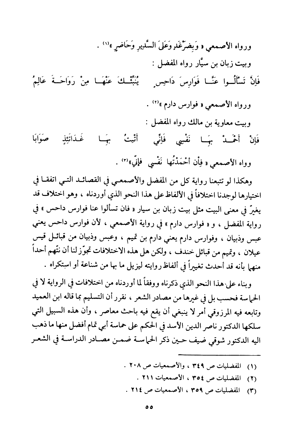 وبناء على هذا النحو الذي ذكرناه ووفقًا لما أوردناه من اختلافات في الرواية لا في الحماسة فحسب بل في غيرها من مصادر الشعر، نقرر أن التسليم بما قاله ابن العميد وتابعه فيه المرزوقي أمر لا ينبغي أن يقع فيه باحث معاصر، وأن هذه السبيل التي سلكها الدكتور ناصر الدين الأسد في الحكم على حماسة أبي تمام أفضل منها ما ذهب إليه الدكتور شوقي ضيف حين ذكر الحماسة ضمن مصادر الدراسة في الشعر