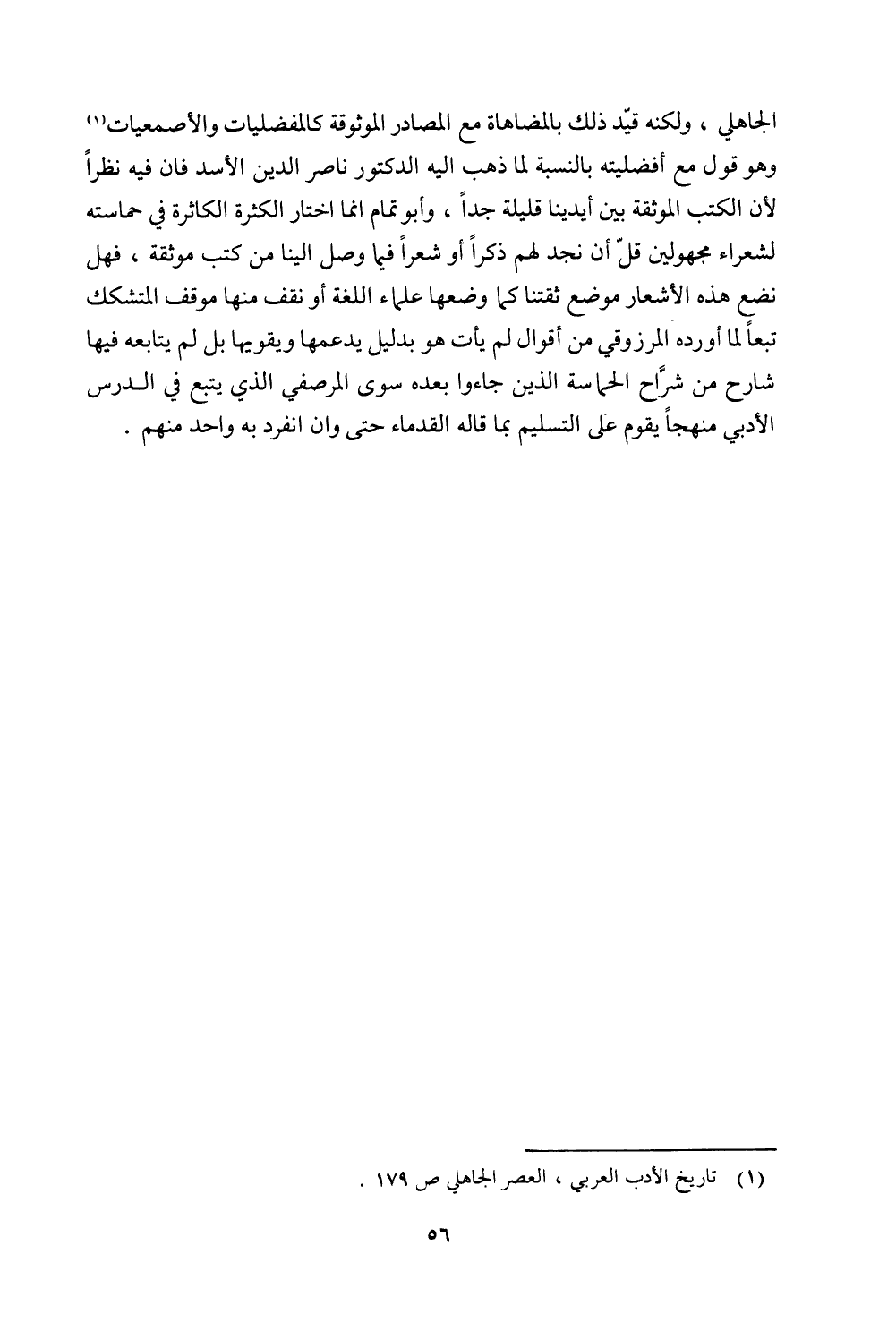 الجاهلي، ولكنه قيد ذلك بالمضاهاة مع المصادر الموثوقة كالمفضليات والأصمعيات وهو قول مع أفضليته بالنسبة لما ذهب إليه الدكتور ناصر الدين الأسد فإن فيه نظرًا لأن الكتب الموثقة يبن أيدينا قليلة جدًا، وأبو تمام إنما اختار الكثرة الكاثرة في حماسته لشعراء مجهولين قل أن نجد لهم ذكرًا أو شعرًا فيما وصل إلينا من كتب موثقة، فهل نضع هذه الأشعار موضع ثقتنا كما وضعها علماء اللغة أو نقف منها موقف المتشكك تبعًا لما أورده المرزوقي من أقوال لم يأت هو بدليل يدعمها ويقويها بل لم يتابعه فيها شارح من شراح الحماسة الذين جاءوا بعده سوى المرصفي الذي يتبع في الدرس الأدبي منهجًا يقوم على التسليم بما قاله القدماء حتى وإن انفرد به واحد منهم.