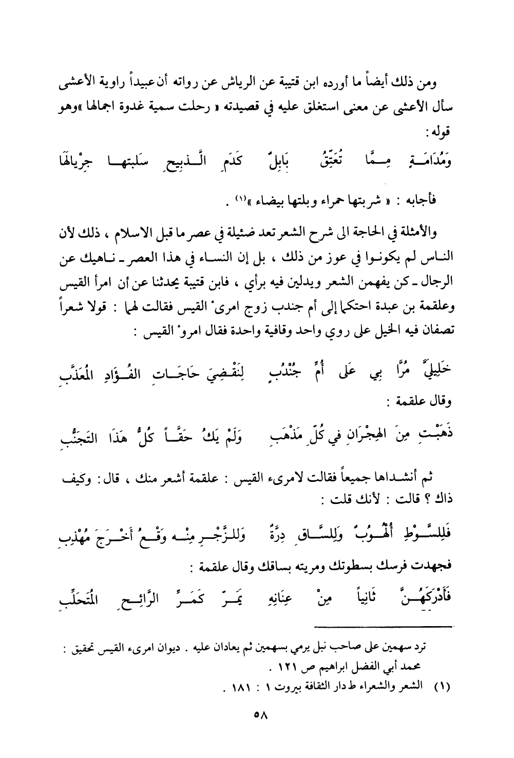 ومن ذلك أيضًا ما أورده ابن قتيبة عن الرياش عن رواته أن عبيدًا رواية الأعشى سأل الأعشي عن معنى استغلق عليه في قصيدته "رحلت سمية غدوة اجمالها" وهو قوله: