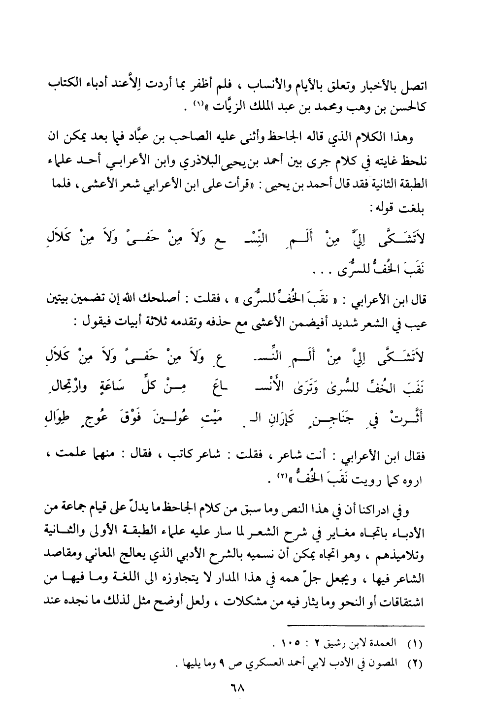 وفي إدراكنا أن في هذا النص وما سبق من كلام الجاحظ ما يدل على قيام جماعة من الأدباء باتجاه مغاير في شرح الشعر لما سار عليه علماء الطبقة الأولى والثانية وتلاميذهم، وهو اتجاه يمكن أن نسميه بالشرح الأدبي الذي يعالج المعاني ومقاصد الشاعر فيها، ويجعل جل هم في هذا المدار لا يتجاوزه إلى اللغة وما فيها من اشتقاقات أو النحو وما يثار فيه من مشكلات، ولعل أوضح مثل لذلك ما نجده عند