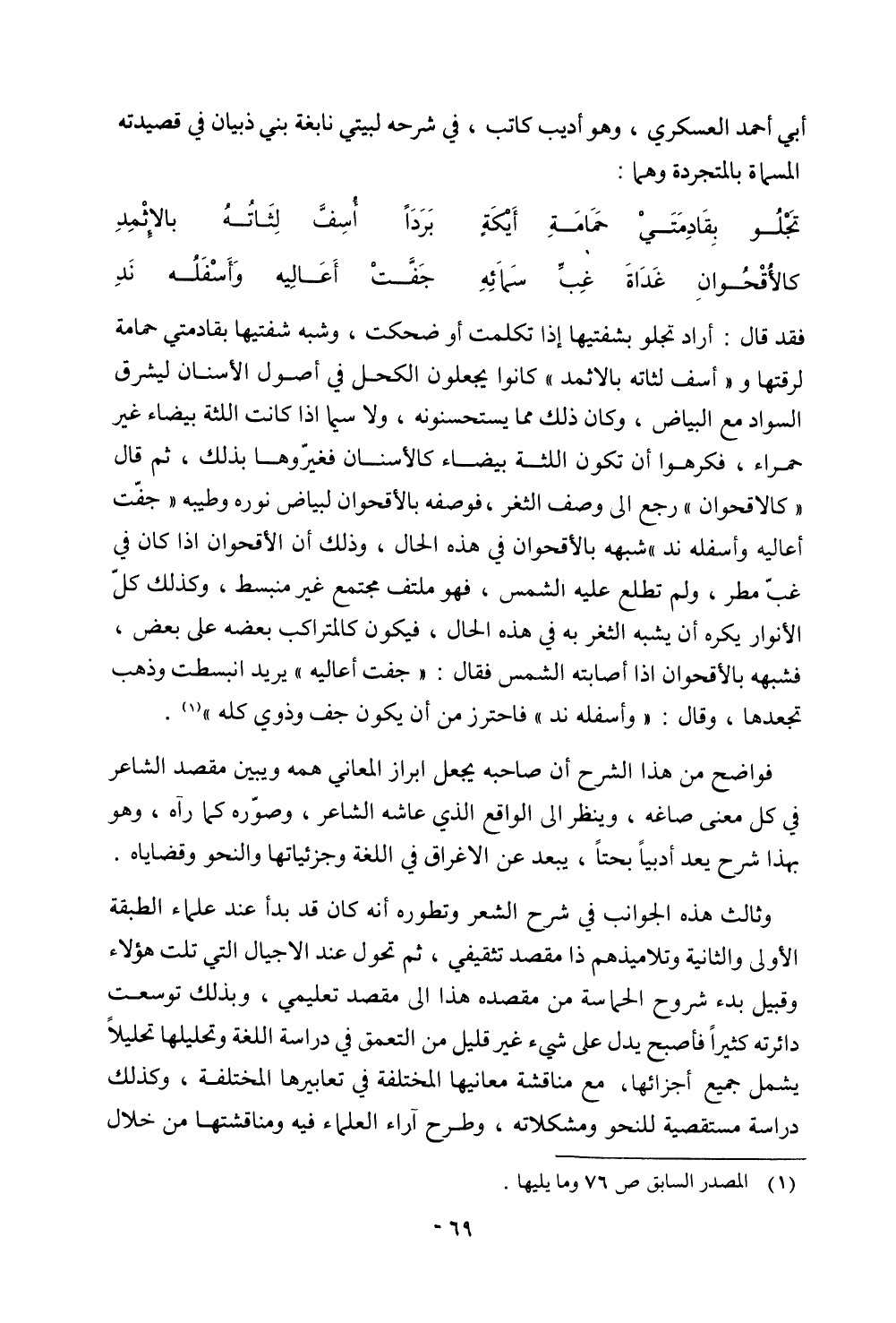 أبي أحمد العسكري، وهو أديب كاتب، في شرحه لبتي نابغة بني ذبيان في قصيدته المسماة بالمتجردة وهما: