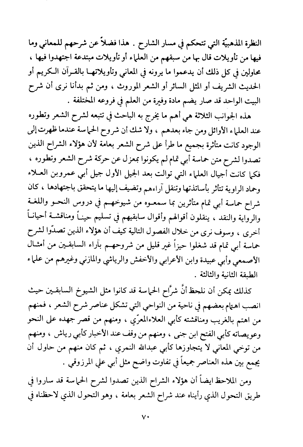 هذه الجوانب الثلاثة هي أهم ما يخرج به الباحث في تتبعه لشرح الشعر وتطوره عند العلماء الأوائل ومن جاء بعدهم، ولا شك أن شروح الحماسة عندما ظهرت إلى الوجود كانت متأثرة بجميع ما طرأ على شرح الشعر بعامة لأن هؤلاء الشراح الذين تصدوا لشرح متن حماسة أبي تمام لم يكونوا بمعزل عن حركة شرح الشعر وتطوره، فكما كانت أجيال العلماء التي توالت بعد الجيل الأول جيل أبي عمرو بن العلاء وحماد الرواية تتأثر بأساتذتها وتنقل آراءهم وتضيف إليها ما يتحقق باجتهادها، كان شراح حماسة أبي تمام متأثرين بما سمعوه من شيوخهم في دروس النحو واللغة والرواية والنقد، ينقلون أقوالهم وأقوال سابقيهم في تسليم حينًا ومناقشة أحيانًا أخرى، وسوف نرى من خلال الفصول التالية كيف أن هؤلاء الذين تصدوا لشرح حماسة أبي تمام قد شغلوا حيزًا غير قليل من شروحهم بآراء السابقين من أمثال الأصمعي وأبي عبيدة وابن الأعرابي والأخفش والرياشي والمازني وغيرهم من علماء الطبقة الثانية والثالثة.