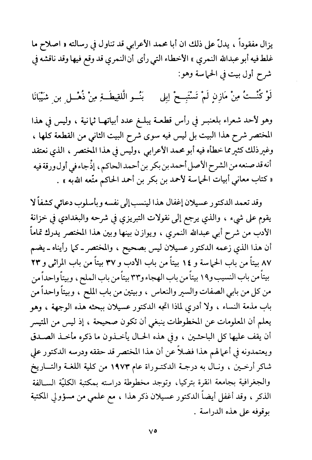 وقد تعمد الدكتور عسيلان إغفال هذا لينسب إلى نفسه وبأسلوب دعائي كشفًا لا يقوم على شيء، والذي يرجع إلى نقولات التبريزي في شرحه والبغدادي في خزانة الأدب من شرح أبي عبد الله النمري، ويوازن بينها وبين هذا المختصر يدرك تمامًا أن هذا الذي زعمه الدكتور عسيلان ليس بصحيح، والمختصر - كما رأيناه - يضم 87 بيتًا من باب الحماسة و 14 بيتًا من باب الأدب و 37 بيتًا من باب المراثي و 23 بيتًا من باب النسيب و 19 بيتًا من باب الهجاء و 33 بيتًا من باب الملح، وبيتًا واحدًا من كل من بابي الصفات والسير والنعاس، وبيتين من باب الملح، وبيتًا واحدًا من باب مذمة النساء، ولا أدري لماذا اتجه الدكتور عسيلان ببحثه هذه الوجهة، وهو يعلم أن المعلومات عن المخطوطات ينبغي أن تكون صحيحة، إذ ليس من المتيسر أن يقف عليها كل الباحثين، وفي هذه الحال يأخذون ما ذكره مأخذ الصدق ويعتمدونه في أعمالهم هذا فضلًا عن أن هذا المختصر قد حققه ودرسه الدكتور علي شارك أرخين، ونال به درجة الدكتوراة عام 1973 من كلية اللغة والتاريخ والجغرافية بجامعة انقرة بتركيا، وتوجد مخطوطة دراسته بمكتبة الكلية السالفة الذكر، وقد أغفل أيضًا الدكتور عسيلان ذكر هذا، مع علمي من مسؤولي المكتبة بوقوفه على هذه الدراسة.
