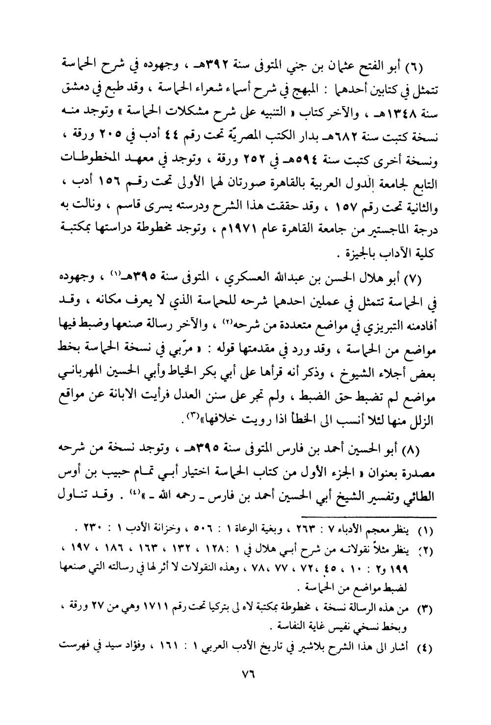 (6) أبو الفتح عثمان بن جني المتوفى سنة 392 هـ، وجهوده في شرح الحماسة تتمثل في كتابين أحدهما: المبهج في شرح أسماء شعراء الحماسة، وقد طبع في دمشق سنة 1348 هـ، والآخر كتاب "التنبيه على شرح مشكلات الحماسة" وتوجد منه نسخة كتبت سنة 682 هـ بدار الكتب المصرية تحت رقم 44 أدب في 205 ورقة، ونسخة أخرى كتبت سنة 594 هـ في 252 ورقة، وتوجد في معهد المخطوطات التابع لجامعة الدول العربية بالقاهرة صورتان لهما الأولى تحت رقم 156 أدب، والثانية تحت رقم 157، وقد حققت هذا الشرح ودرسته يسرى قاسم، ونالت به درجة الماجستير من جامعة القاهرة عام 1971 م، وتوجد مخطوطة دراستها بمكتبة كلية الآداب بالجيزة.