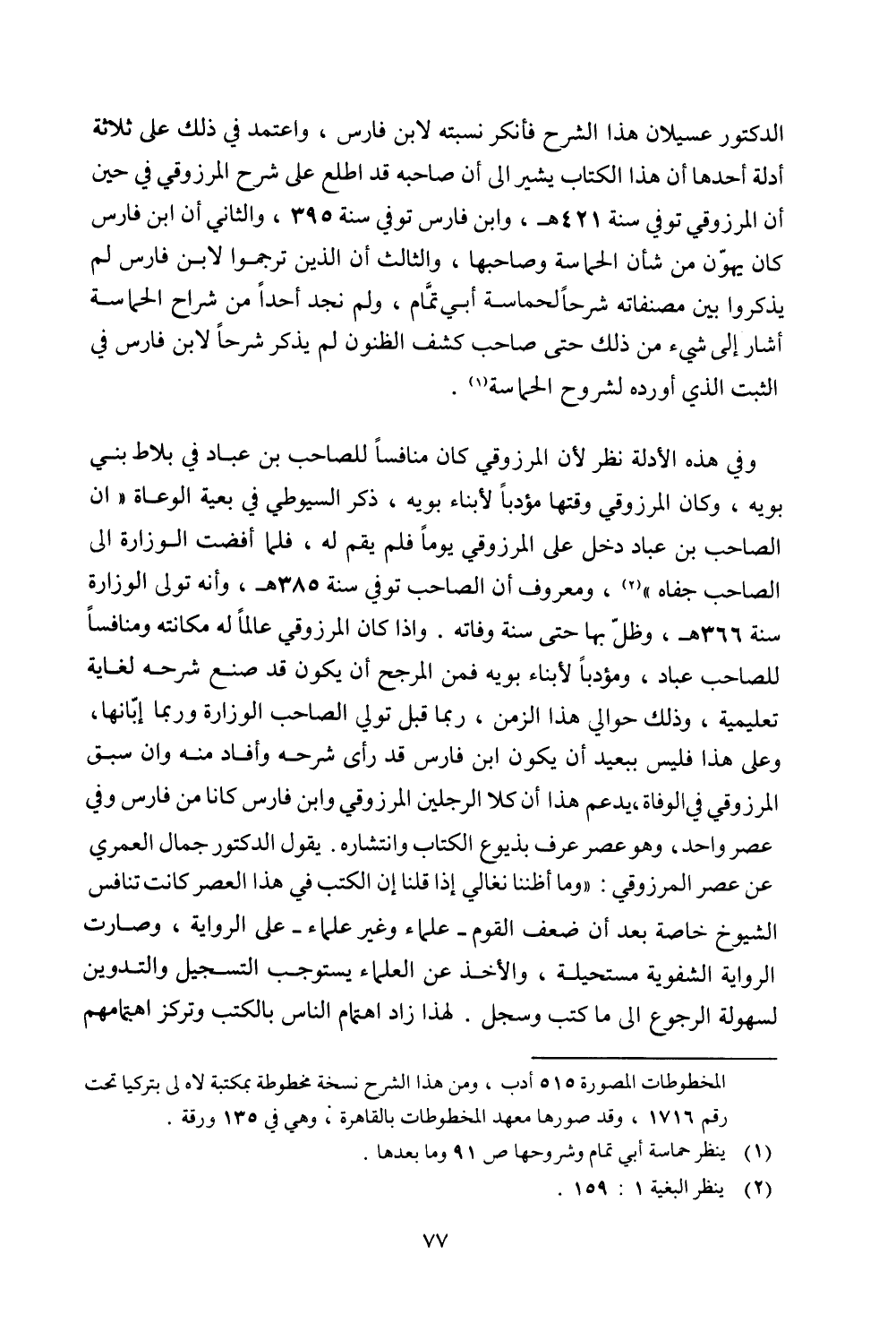 وفي هذه الأدلة نظر لأن المرزوقي كان منافسًا للصاحب بن عباد في بلاط بني بويه، وكان المرزوقي وقتها مؤدبًا لأبناء بويه، ذكر السيوطي في بعية الوعاة "أن الصاحب بن عبد دخل على المروزوقي يومًا فلم يقم له، فلما أفضت الوزارة إلى الصاحب جفاه"، ومعروف أن الصاحب توفي سنة 385 هـ، وأنه تولى الوزارة سنة 366 هـ، وظل بها حتى سنة وفاته. وإذا كان المرزوقي عالمًا له مكانته ومنافسًا للصاحب عباد، ومؤدبًا لأبناء بويه فمن المرجح أن يكون قد صنع شرحه لغاية تعليمية، وذلك حوالي هذا الزمن، ربما قبل تولي الصاحب الوزارة وربما إبانها، وعلى هذا فليس ببعيد أن يكون ابن فارس قد رأى شرحه وأفاد منه وإن سبق المرزوقي في الوفاة، يدع هذا أن كلا الرجلين المرزوقي وابن فارس كانا من فارس وفي عصر واحد، وهو عصر عرف بذيوع الكتاب وانتشاره. يقول الدكتور جمال العمري عن عصر المرزوقي: "وما أظننا نغالي إذا قلنا إن الكتب في هذا العصر كانت تنافس الشيوخ خاصة بعد أن ضعف القوم - علماء وغير علماء - على الرواية، وصارت الرواية الشفوية مستحيلة، والأخذ عن العلماء يستوجب التسجيل والتدوين لسهولة الرجوع إلى ما كتب وسجل. لهذا زاد اهتمام الناس بالكتب وتركز اهتمامهم