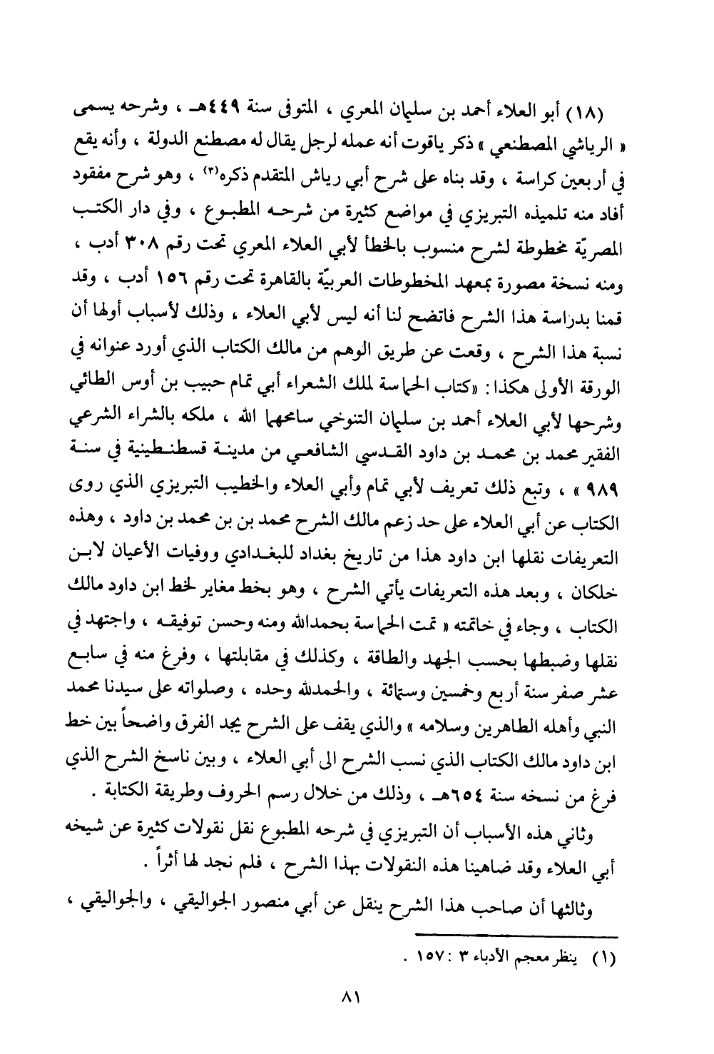 (18) أبو العلاء أحمد بن سليمان المعري، والمتوفى سنة 449 هـ، وشرحه يسمى "الرياشي المصطنعي" ذكر ياقوت أنه عمله لرجل يقال له مصطنع الدولة، وأنه يقع في أربعين كراسة، وقد بناه على شرح أبي رياض المتقدم ذكره، وهو شرح مفقود أفاد منه تلميذه التبريزي في مواضع كثيرة من شرحه المطبوع، وفي دار الكتب المصرية مخطوطة لشرح منسوب بالخطأ لأبي العلاء المعري تحت رقم 308 أدب، ومنه نسخة مصورة بمعهد المخطوطات العربية بالقاهرة تحت رقم 156 أدب، وقد قمنا بدراسة هذا الشرح فاتضح لنا أنه ليس لأبي العلاء، وذلك لأسباب أولها ان نسبة هذا الشرح، وقعت عن طريق الوهم من مالك الكتاب الذي أورد عنوانه في الورقة الأولى هكذا: "كتاب الحماسة لملك الشعراء أبي تمام حبيب بن أوس الطائي وشرحها لأبي العلاء أحمد بن سليمان التنوخي سامحهما الله، ملكه بالشراء الشرعي الفقير محمد بن محمد بن داود القدسي الشافعي من مدينة قسطنطينية في سنة 989"، وتبع ذلك تعريف لأبي تمام وأبي العلاء والخطيب التبريزي الذي روى الكتاب عن أبي العلاء على حد زعم مالك الشرح محمد بن محمد بن داود، وهذه التعريفات نقلها ابن داود هذا من تاريخ بغداد للبغدادي ووفيات الأعيان لابن خلكان، وبعد هذه التعريفات يأتي الشرح، وهو بخط مغاير لخط ابن داود مالك الكتاب، وجاء في خاتمته "تمت الحماسة بحمد الله ومنه وحسن توفيقه، واجتهد في نقلا وضبطها بحسب الجهد والطاقة، وكذلك في مقابلتها، وفرغ منه في سابع عشر صفر سنة أربع وخمسين وستمائة، والحمد لله وحده، وصلواته على سيدنا محمد النبي وأهله الطاهرين وسلامه" والذي يقف على الشرح يجد الفرق واضحًا بين خط ابن داود مالك الكتاب الذي نسب الشرح إلى أبي العلاء، وبين ناسخ الشرح الذي فرغ من نسخه سنة 654 هـ، وذلك من خلال رسم الحروف وطريقة الكتابة.