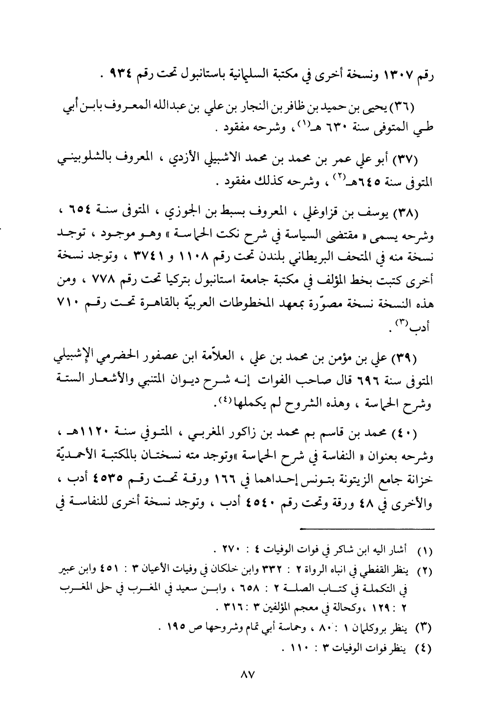 (39) على بن مؤمن بن محمد بن علي، العلامة ابن عصفور الحضرمي الإشبيلي المتوفى سنة 696 قال صاحب الفوات إنه شرح ديوان المتنبي والأِشعار الستة وشرح الحماسة، وهذه الشروح لم يكملفها.