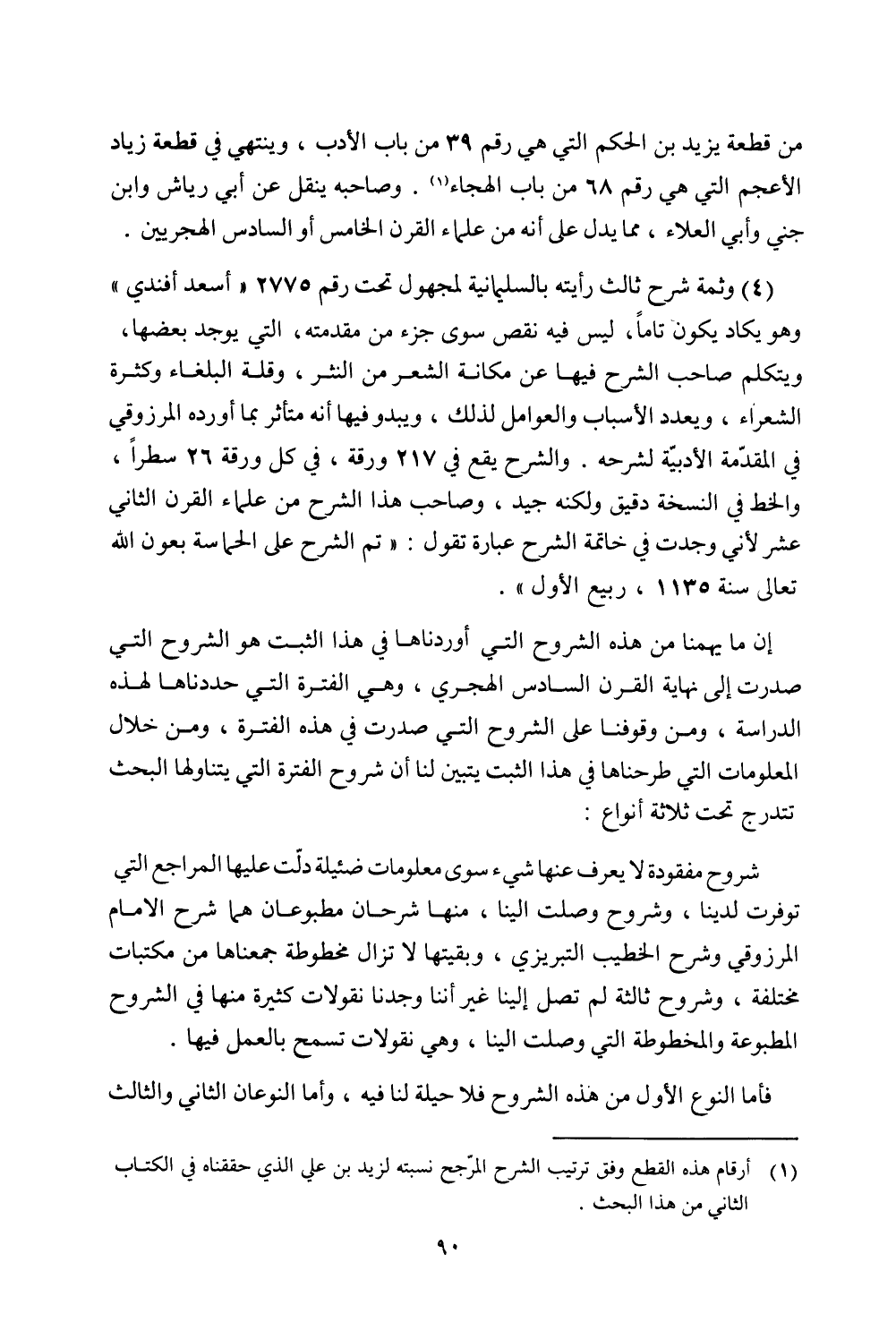 (4) وثمة شرح ثالث رأيته بالسليمانية لمجهول تحت رقم 2775 "أسعد أفندي" وهو يكاد يكون تامًا، ليس فيه نقص سوى جزء من مقدمته، التي يوجد بعضها، ويتكلم صاحب الشرح فيها عن مكانة الشعر من النثر، وقلة البلغاء وكثرة الشعراء، ويعدد الأسباب والعوامل لذلك، ويبدو فيها أنه متأثر بما أورده المرزوقي في المقدمة الأدبية لشرحه. والشرح يقع في 217 ورقة، في كل ورقة 26 سطرًا، والخط في النسخة دقيق ولكنه جيد، وصاحب هذا الشرح من علماء القرن الثاني عشر لأني وجدت في خاتمة الشرح عبارة تقول: "تم الشرح على الحماسة بعون الله تعالى سنة 1135، ربيع الأول".