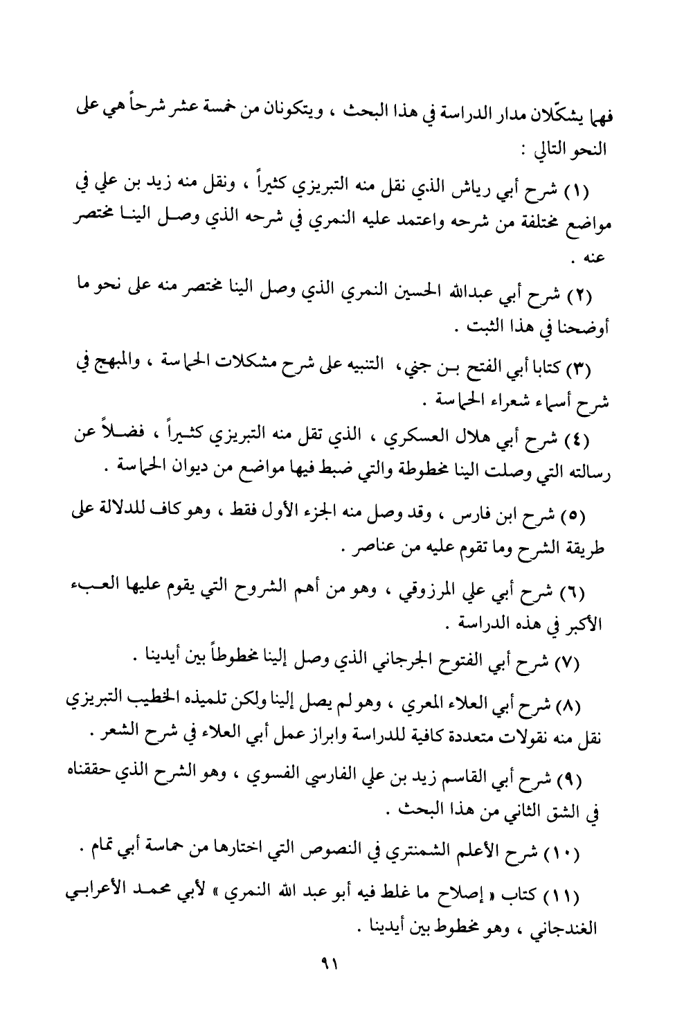 (4) شرح أبي هلال العسكري، الذي تقل منه التبريزي كثيرًا، فضلًا عن رسالته التي وصلت إلينا مخطوطة والت ضبط فيها مواضع من ديوان الحماسة.