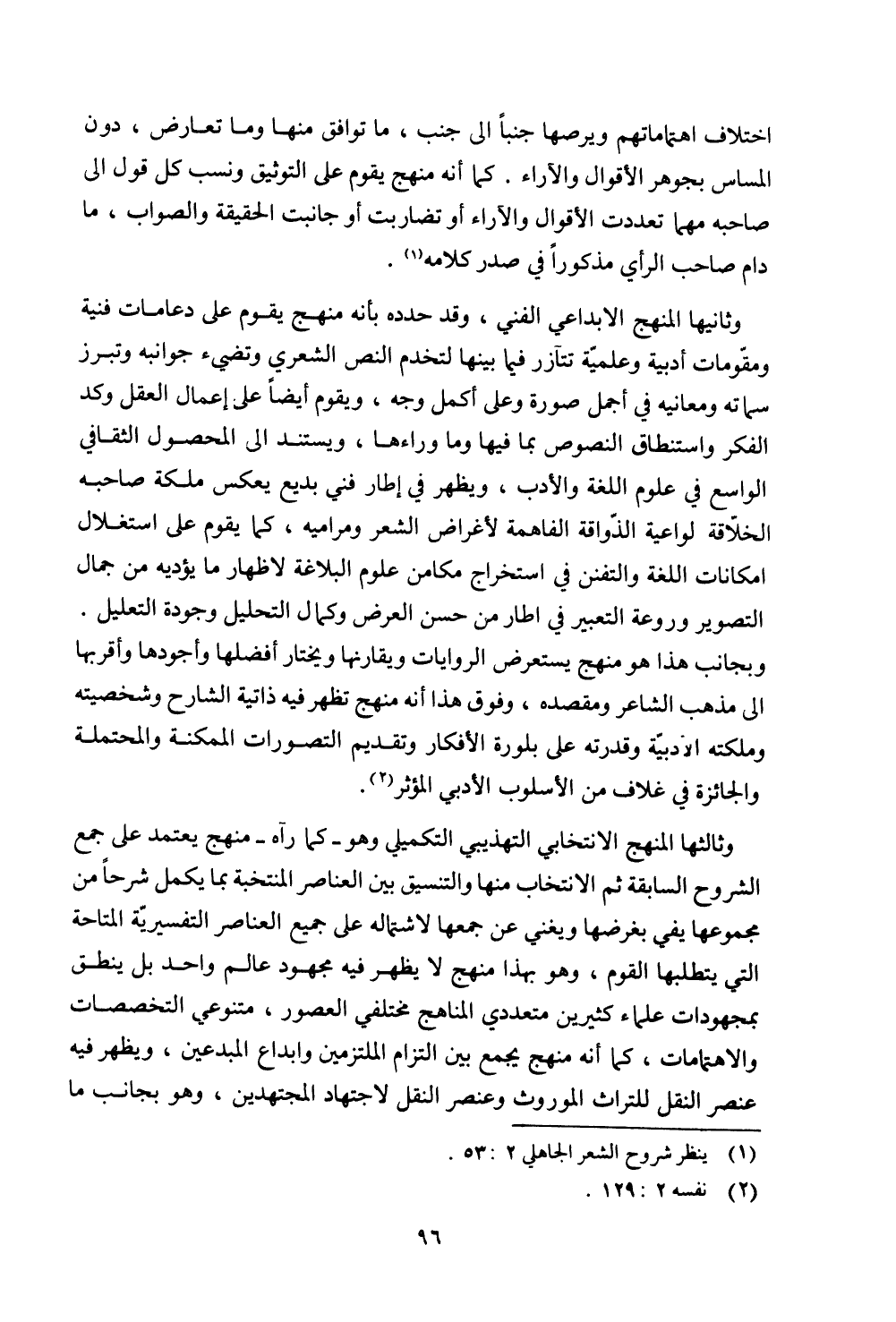 وثانيها المنهج الإبداعي الفني، وقد حدده بأنه منهج يقوم على دعامات فنية ومقومات أدبية وعلمية تتآزر فيما بينها لتخدم النص الشعري وتضيء جوانبه وتبرز سماته ومعانية في أجمل صورة وعلى أكمل وجه، ويقوم أيضًا على إعمال العقل وكد الفكر واستنطاق النصوص بما فيها وما وراءها، ويستند إلى المحصول الثقافي الواسع في علوم اللغة والأدب، ويظهر في إطار فني بديع يعكس ملكة صاحبه الخلاقة لواعية الذواقة الفاهمة لأغراض الشعر ومراميه، كما يقوم على استغلال امكانات اللغة والتفنن في استخراج مكامن علوم البلاغة لإظهار ما يؤديه من جمال التصوير وروعة التعبير في إطار من حسن العرض وكمال التحليل وجوده التعليل. وبجانب هذا هو منهج يستعرض الروايات ويقارنها ويختار أفضلها وأجودها وأقربه إلى مذهب الشاعر ومقصده، وفوق هذا أنه منهج تظهر فيه ذاتية الشارح وشخصيته وملكته الأدبية وقدرته على بلورة الأفكار وتقديم التصورات الممكنة والمحتملة والجائزة في غلاف من الأسلوب الأدبي المؤثر.