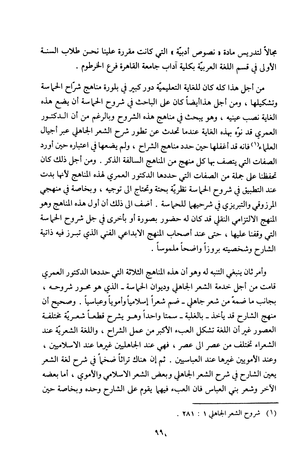 وأمر ثان ينبغي التنبه له وهو أن هذه المناهج الثلاثة التي حددها الدكتور العمري قامت من أجل خدمة الشعر الجاهلي وديوان الحماسة - الذي هو محور شروحه، بجانب ما ضمه من شعرًا جاهلي - ضم شعرًا إسلاميًا وأمويًا وعباسيًا. وصحيح أن منهج الشارح قد يأخذ - بالغلبة - سمتا واحدًا وهو يشرح قطعًا شعرية مختلفة العصور غير أن اللغة تشكل العبء الأكبر من عمل الشراح، واللفة الشعرية عند الشعراء تختلف من عصر إلى عصر، فهي عند الجاهليين غيرها عند الإسلاميين، وعند الأمويين غيرها عند العباسيين. ثم إن هناك تراثًا ضخما في شرح لغة الشعر يعين الشارح في شرح الشعر الجاهلي وبعض الشعر الإسلامي والأموي، أما بعضه الأخر وشعر بني العباسي فان العب، فيهما يقوم على الشارح وحده وبخاصة حين