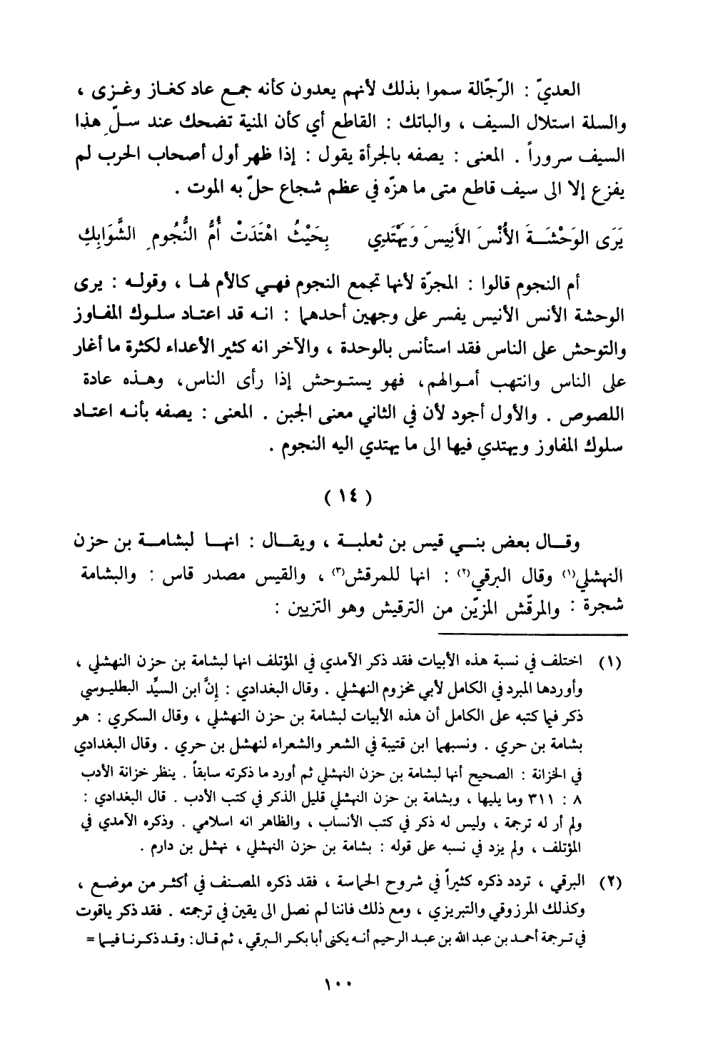 أم النجوم قالوا: المجرة لأنها تجمع النجوم كالأم لها، وقوله: يرى الوحشة الأنس الأنيس يفسر على وجهين أحدهما: أنه قد اعتاد سلوك المفاوز والتوحش على الناس فقد استأنس بالوحدة، والآخر أنه كثير الأعداء لكثرة ما أغار على الناس وانتهت أموالهم، فهو يستوحش إذا رأى الناس، وهذه عادة اللصوص. والأول أجود لأن في الثاني معنى الجبن. المعنى: يصفه بأنه اعتاد سلوك المفاوز ويهتدي فيها إلى ما يهتدي اليه النجوم.