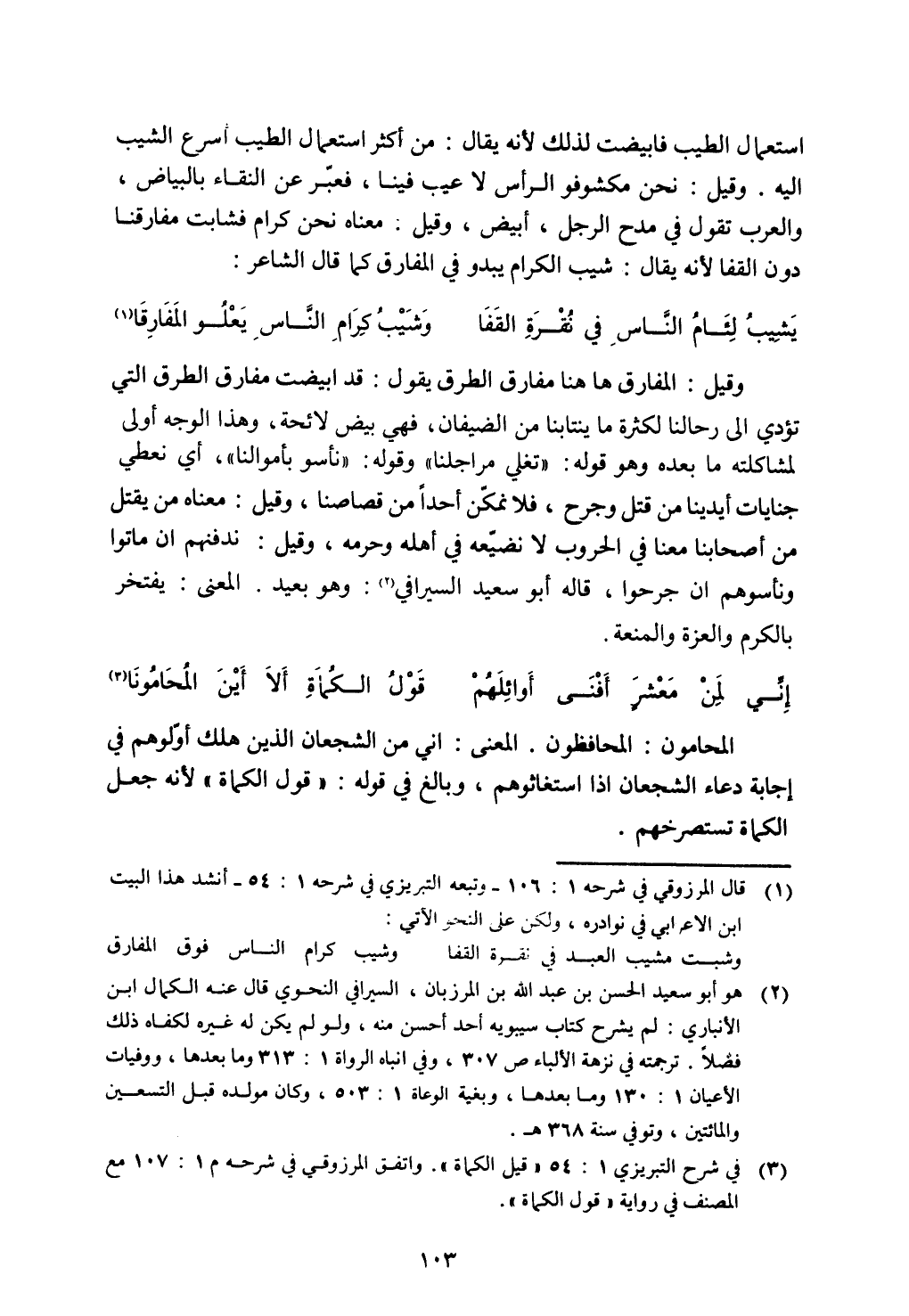 وقيل: المفارق ها هنا مفارق الطرق يقول: قد ابيضت مفارق الطرق التي تؤدي إلى رحالنا لكثرة ما ينتابنا من الضيفان، فهي بيض لائحة، وهذا الوجه أولى لمشاكلته ما بعده وهو قوله: ((تغلي مراجلنا)) وقوله: ((نأسو بأموالنا))، أي نعطي جنايات أيدينا من قتل وجرح، فلا نمكن أحداً من قصاصنا، وقيل: معناه من يقتل من أصحابنا معنا في الحروب لا نضيعه في أهله وحرمه، وقيل: ندفنهم أن ماتوا ونأسوهم أن جرحوا، قاله أبو سعيد السيرافي: وهو بعيد. المعنى: يفتخر بالكرم والعزة والمنعة.